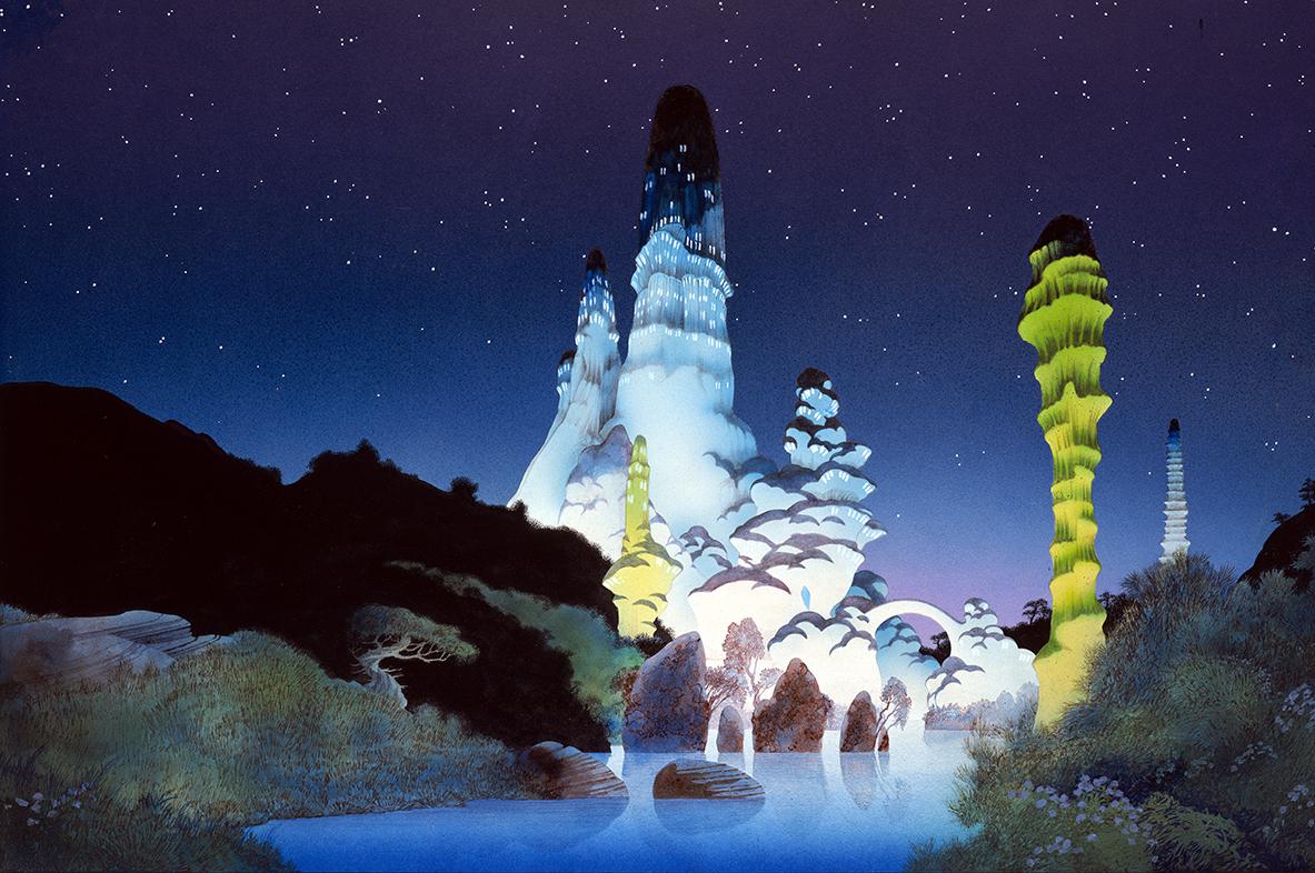 His landscapes tend to combine naturalism with fantasy: Rock formations and caves that are just a little too twisty, waterfalls pouring off the edge of the earth, mossy islands floating in space.