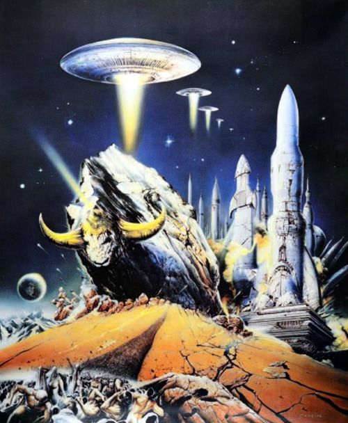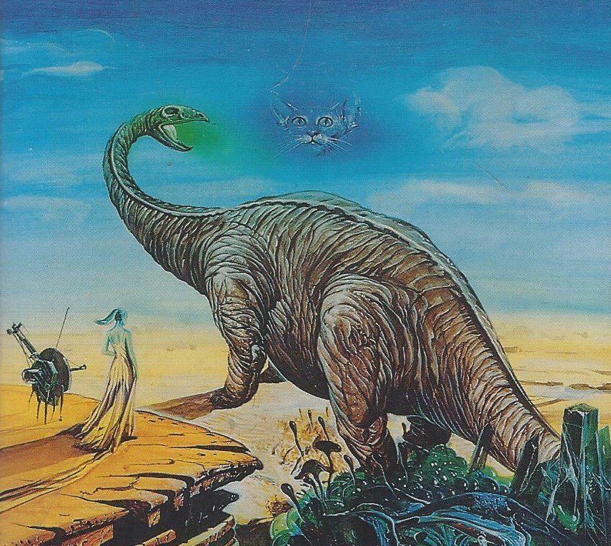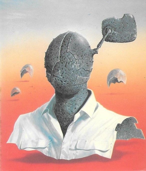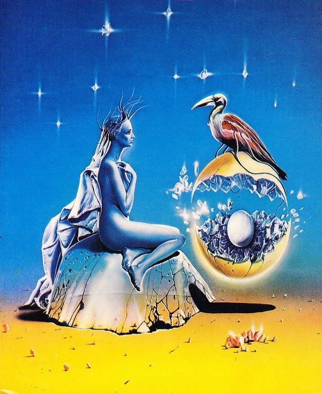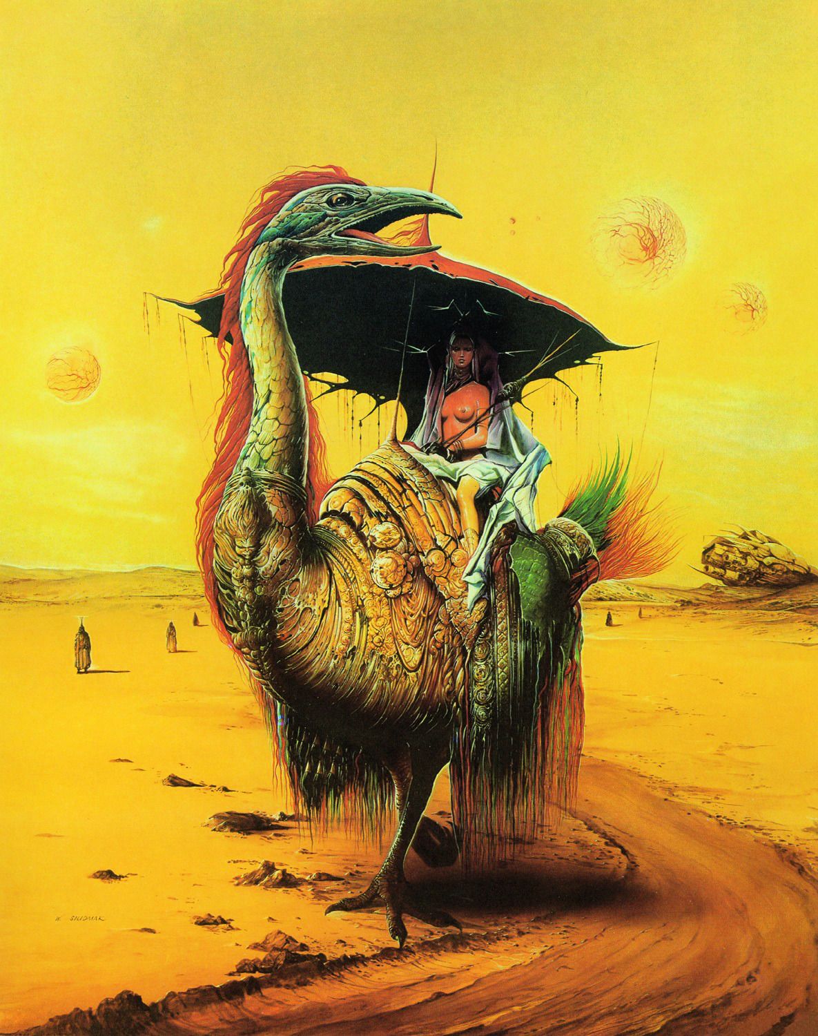 A topless woman rides an ostrich-like alien bird in a searingly orange desert. Hooded figures stalk behind her and the circulatory systems of giant eyeballs float above. This cover to a 1982 French sci-fi and fantasy anthology is classic Wojtek Siudmak.