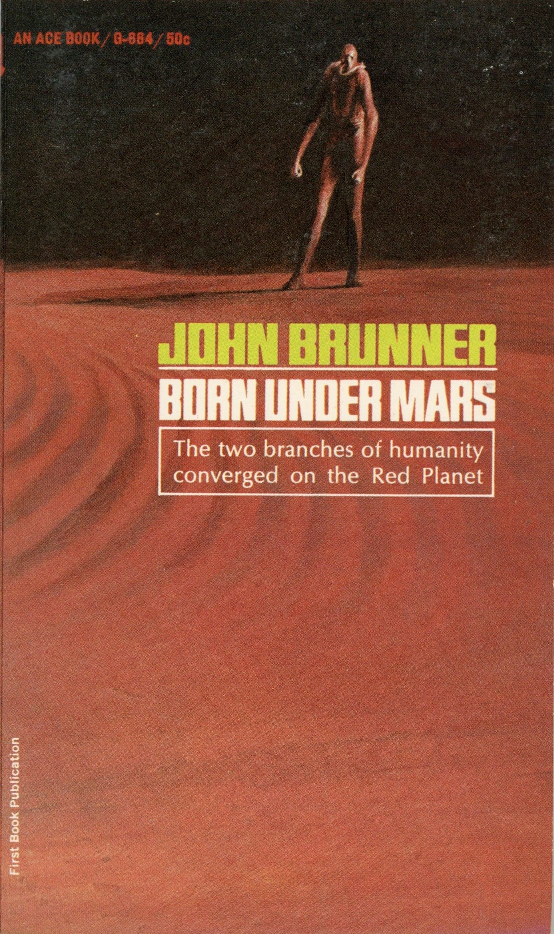 I love John Schoenherr's interpretation, done for a 1967 edition of Born Under Mars. The mask tube is just barely visible, since the unique composition of the scene instead draws one's attention to the vast, lifeless sand of Mars. Schoenherr is so good.