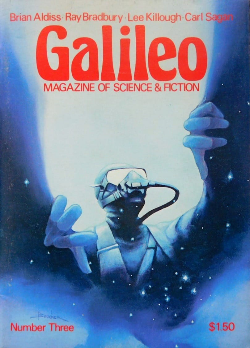 Jones has a knack for grounded, natural sci-fi, so it's no wonder a pre-existing technology like these masks would be recontextualized like this. Plenty of other artists leaned into this style of space helmet, though, like Tom Barber’s cover art for Galileo's April 1977 issue:
