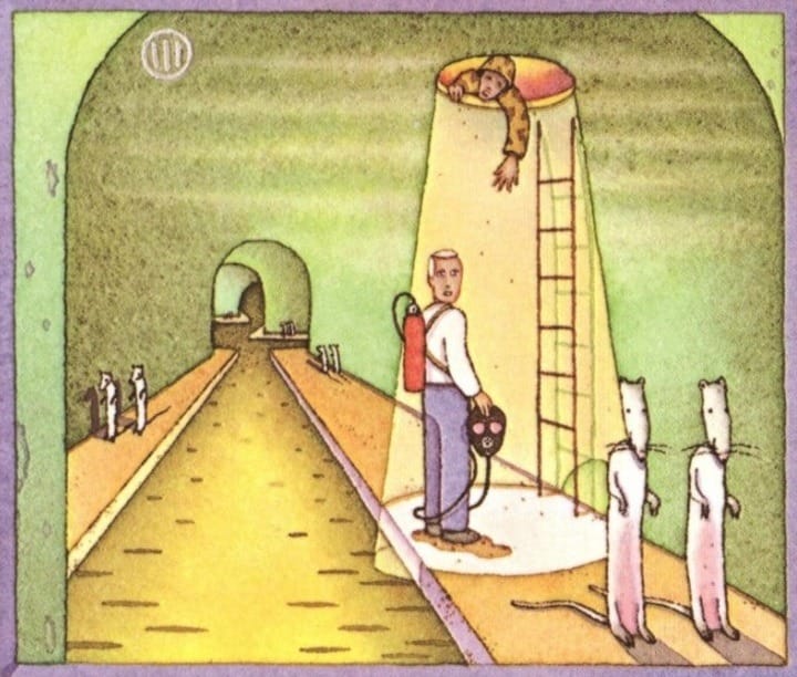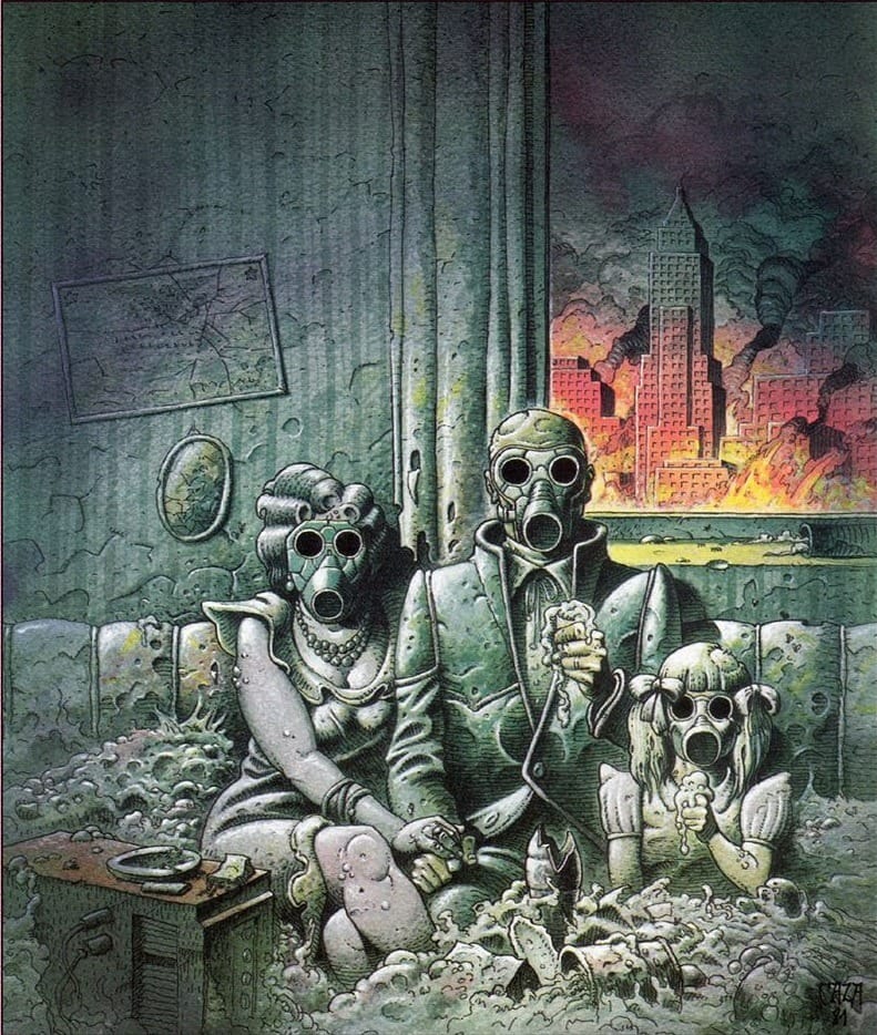 One of my favorite Moebius illustrations – and there are many to choose from – has another apocalyptic gas mask.