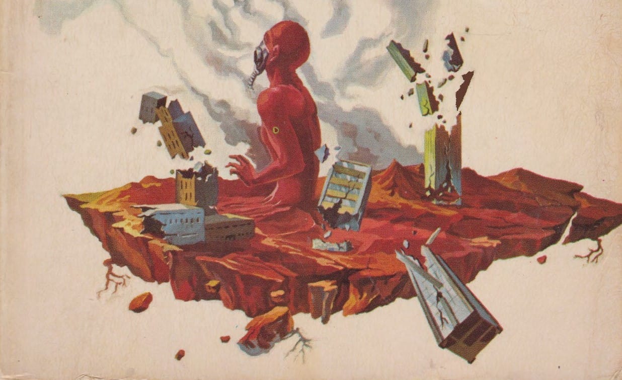 The cover art for the 1973 edition of Philip Wylie’s The End of the Dream is credited to "Podium II" on its copyright page – I'm not sure if that name refers to an artist or a marketing company. Either way, it features a gas mask in the typical setting you'd expect to find one: A post-apocalypse.