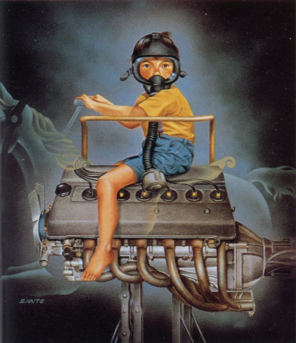 The apocalyptic implications of a gas mask come through in surrealist images, too, like this somewhat haunting late 70s illustration by Sadao Naito: