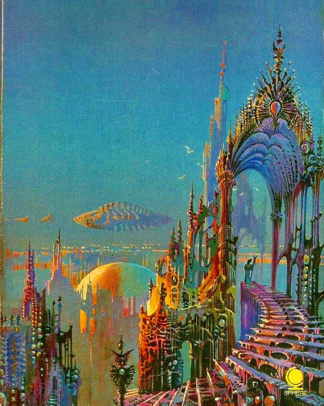 Here’s Bruce Pennington’s 1974 cover for The World of Null-A, by A. E. van Vogt. It’s possibly the ideal 70s sci-fi art: Colorful, complex, majestic, meditative. One of my top picks for a potential cover or back cover.
