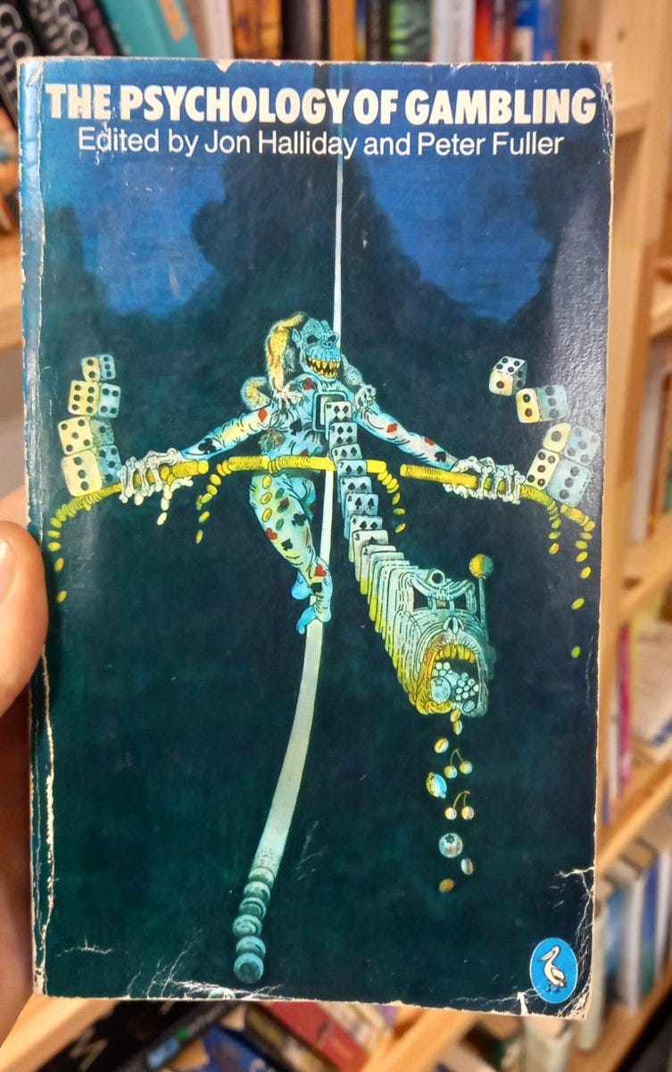 Someone posted a thrift shop find on Twitter a good while back: This absolutely gonzo cover to a 1977 Penguin edition of the nonfiction book The Psychology of Gambling.