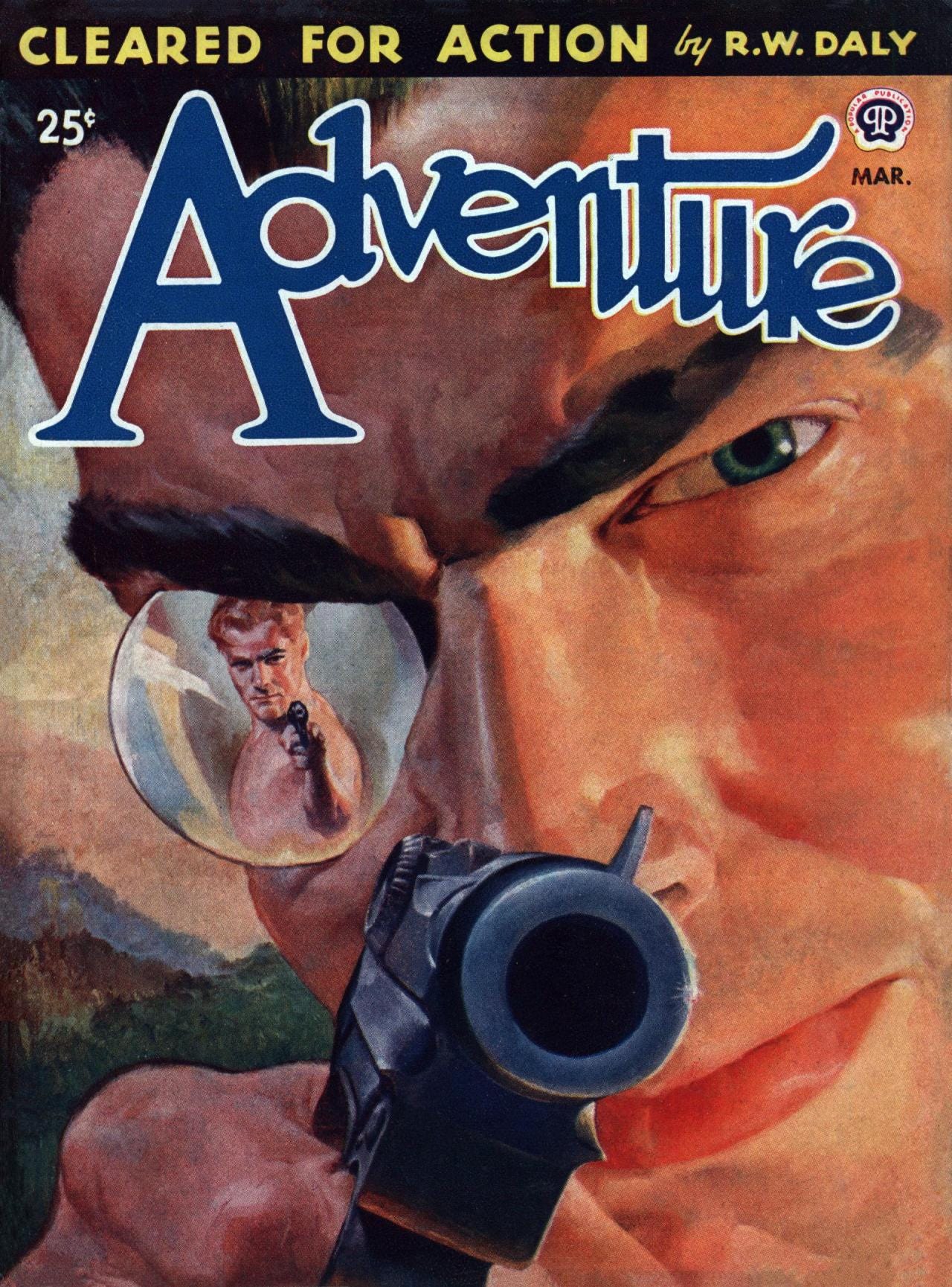 For evidence of this, I already had the fact that a lot of “skeleton in spacesuit” sci-fi covers feature the desert, mirroring adventure pulp stories of vultures attacking a parched hero in a western. But the “reflection in a space helmet” trope might also have a pulp ancestor, if Griffith Foxley’s March 1946 cover art for Adventure magazine is any indicator: