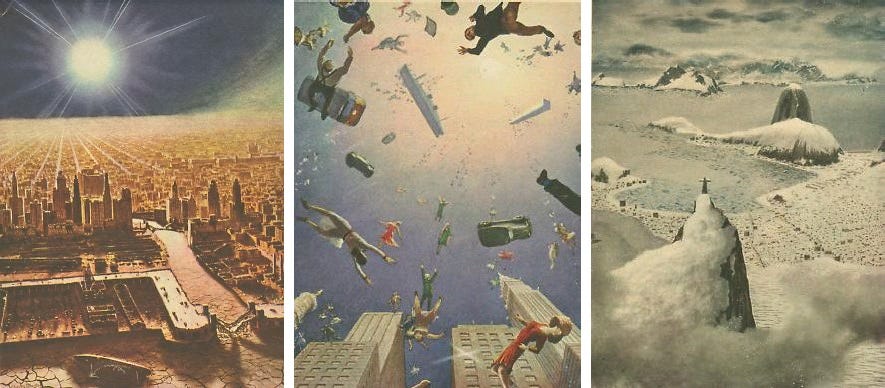 Here are a few of my favs, from left to right: The Sun’s expansion boils off Lake Michigan; A white dwarf star’s massive gravity sucks up everything; and Rio de Janeiro freezes after a dark star “kidnaps” Earth from the Sun.
