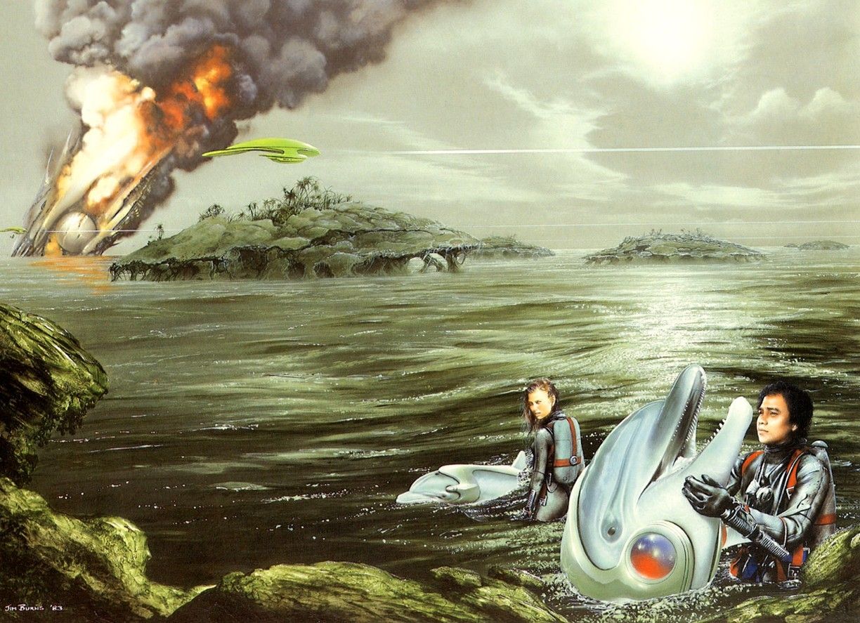 David Brin’s Startide Rising is behind the best dolphin suits: Here’s the very first edition cover, by Jim Burns in 1983.