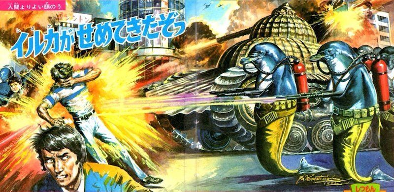 The earliest dolphin suit illustration might be this 1971 one by Shigeru Komatsuzaki. It's definitely the only one with a seashell-themed tank.
