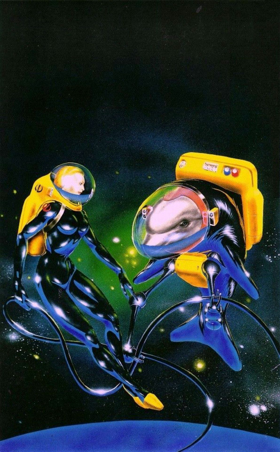 David Cherry’s 1985 frontispiece to David Brin’s Startide Rising also features gripper arms, and might be the most beautiful sci-fi dolphin artwork: