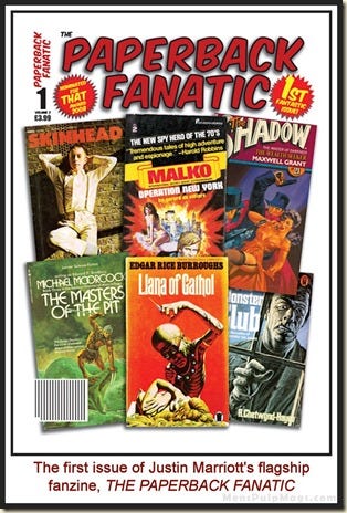 So I somehow managed to be a huge genre fiction nerd for years without learning about vintage paperback fanzine publisher Justin Marriott. But last week I was trying to track down an artist credit for an obscure paperback, and found a note citing an issue of some magazine called “The Paperback Fanatic.”