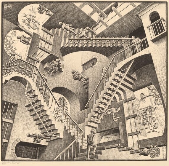 I'd love to write a book about M.C. Escher's impact on pop culture (although he apparently hated pop culture, so getting the rights might be a challenge). I'd probably have to dedicate multiple chapters to this lithograph, Relativity, since it's referenced far more than the rest of his oeuvre – just check out how Wikipedia broke down its "M. C. Escher in popular culture" page.