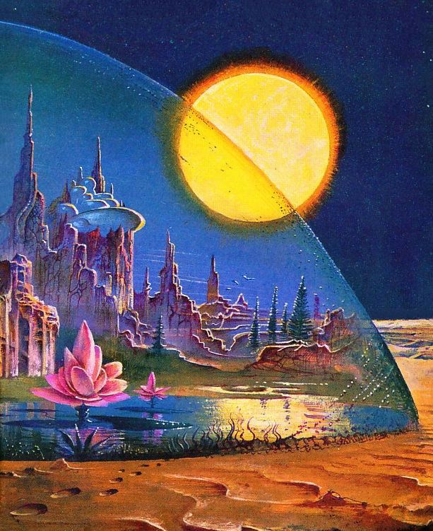 I might never have paid much attention to John Harris’s paintings if they hadn’t appeared so often at Adam Rowe’s 70s Sci-fi Art. Harris is also featured in Rowe’s new book, Worlds Beyond Time, with a few examples that sent me looking for more. I like science-fiction art when it’s dealing with megastructures, especially if those structures aren’t readily interpretable as buildings, spaceships or alien artefacts. This is SF art in the service of the philosophical Sublime, a quality which, since the 1940s, you don’t find very much in painting outside the work of illustrators or artists of the fantastic.