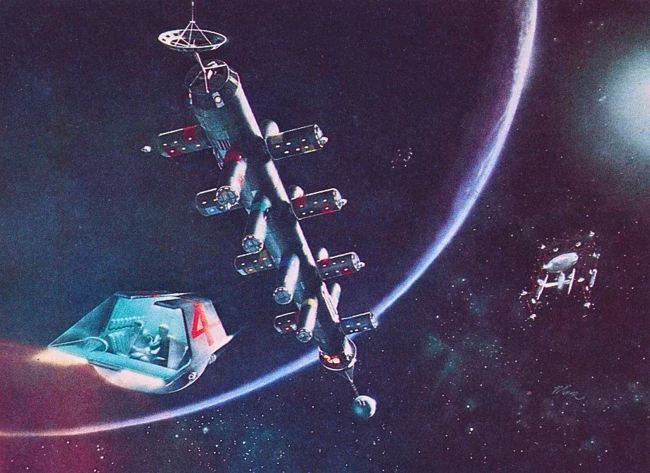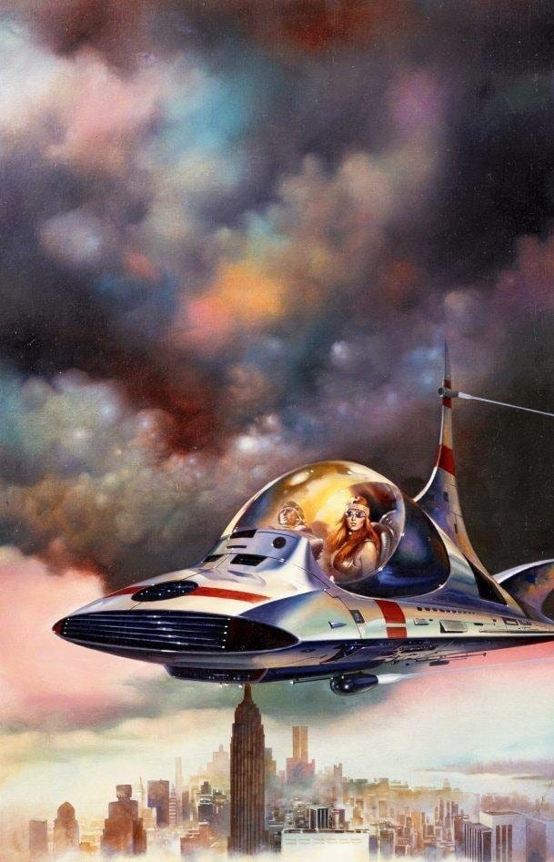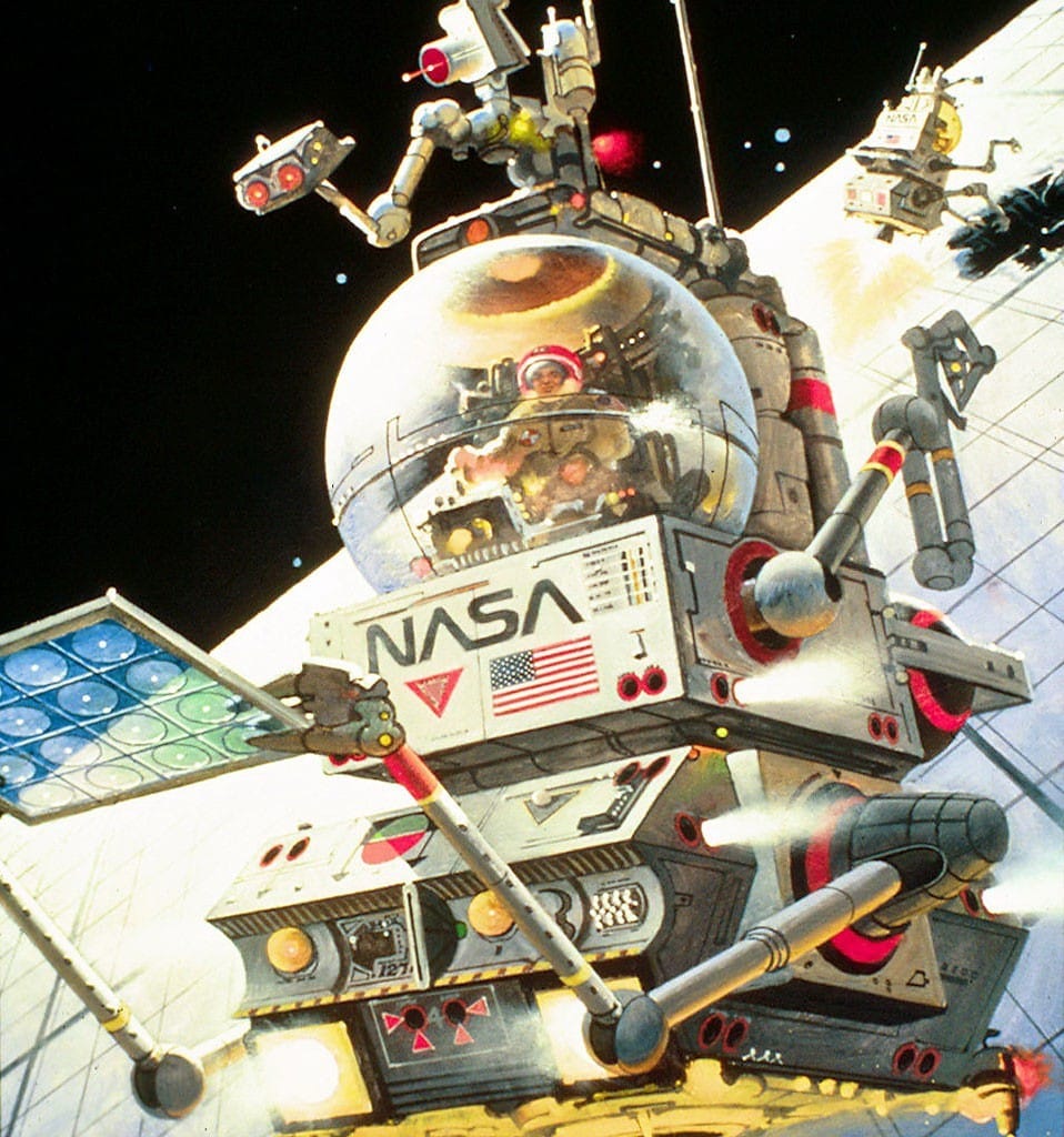 Translucent windows make more sense on smaller maneuverable craft like the one installing a solar panel in this Robert McCall illustration. It's similar to a bubble submarine.