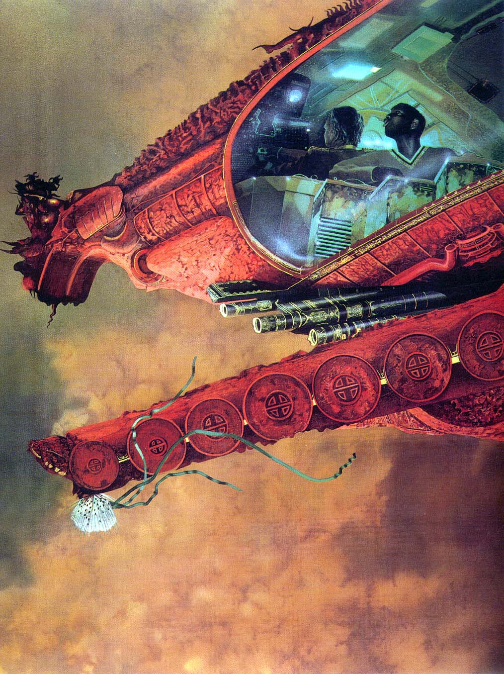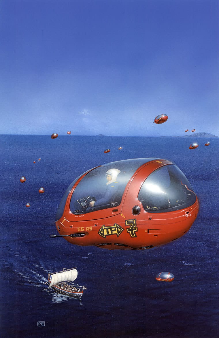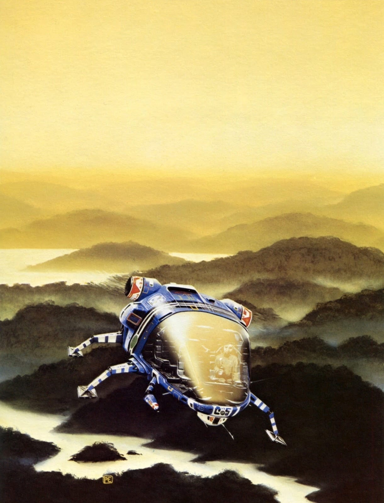 Here they're cruising by a pyramid on White's 1979 cover to The Tar-Aiym Krang, by Alan Dean Foster.
