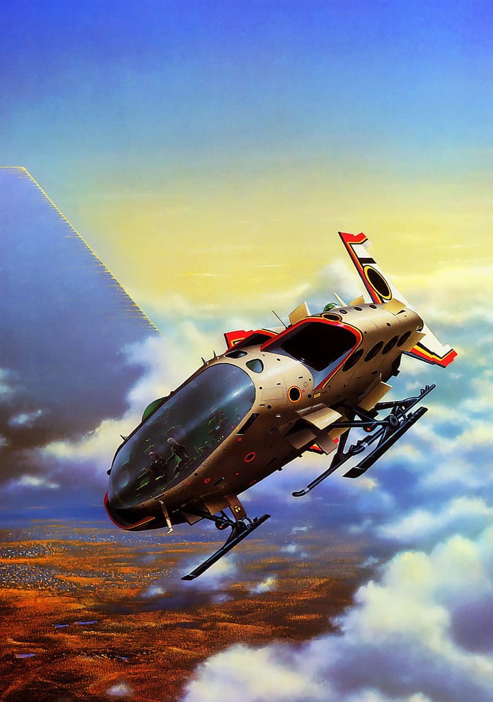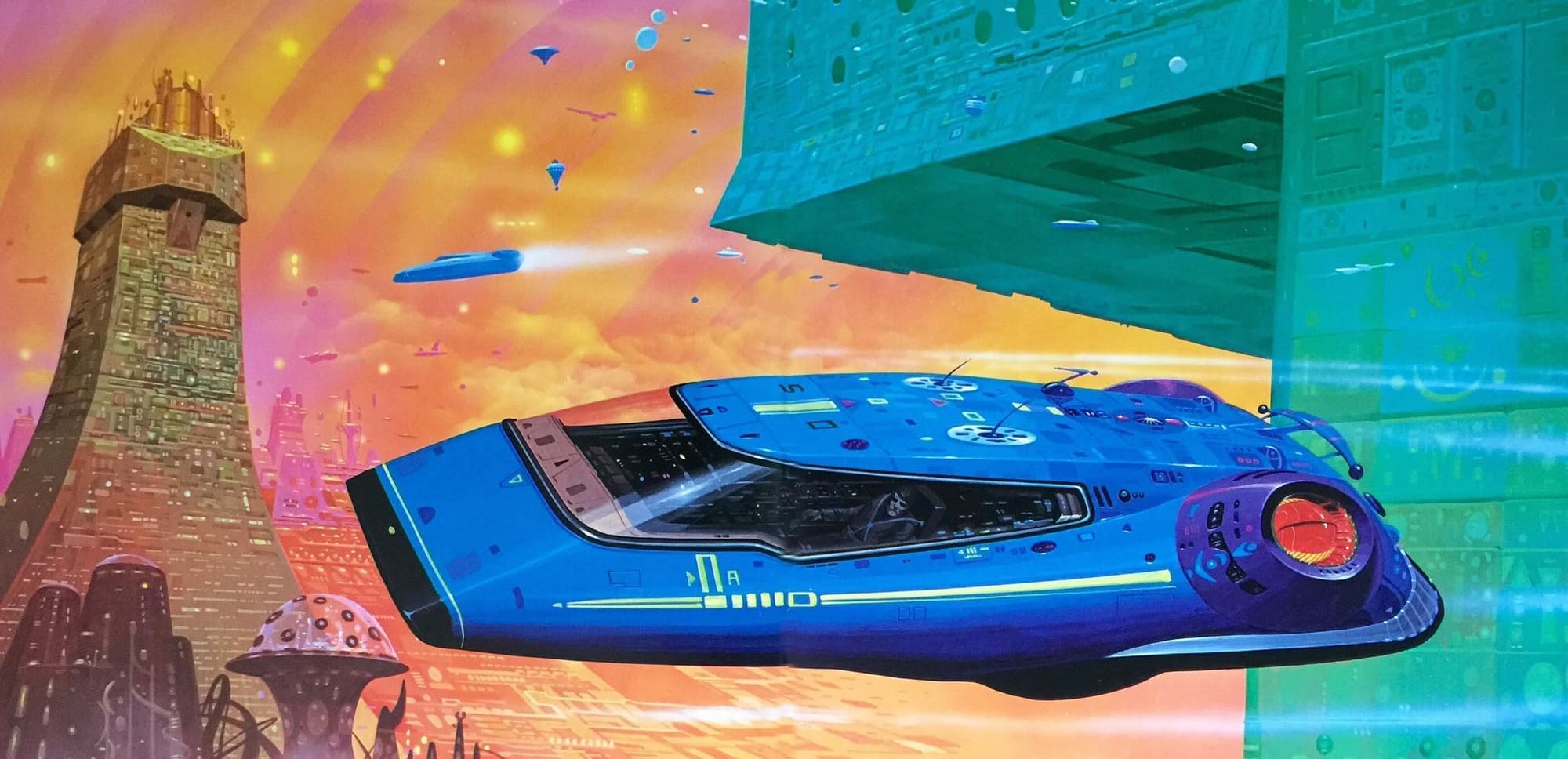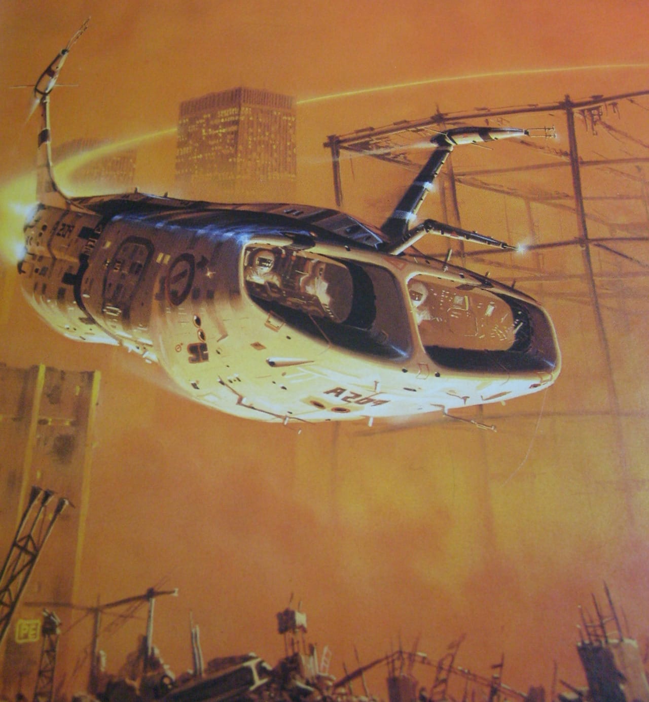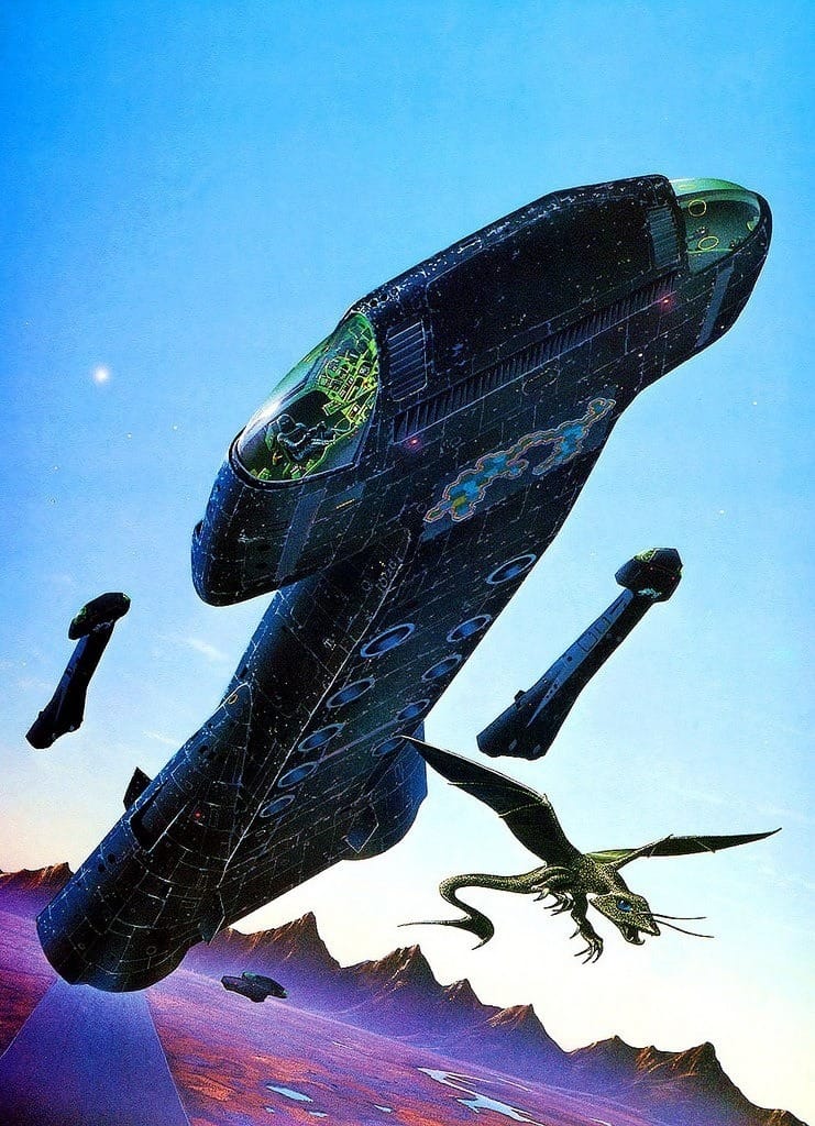 Here they're cruising by a pyramid on White's 1979 cover to The Tar-Aiym Krang, by Alan Dean Foster.