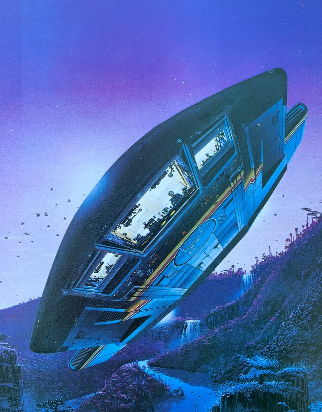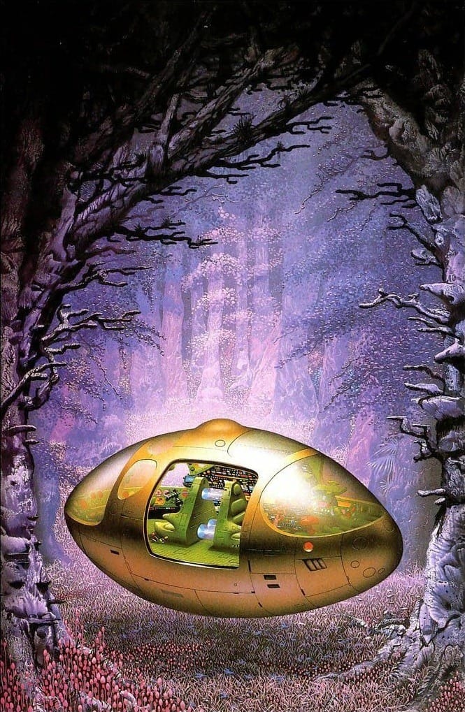 The spaceship doesn't even have to depict humans. For Tim White’s 1983 cover to The Ceres Solution, by Bob Shaw, it's empty...