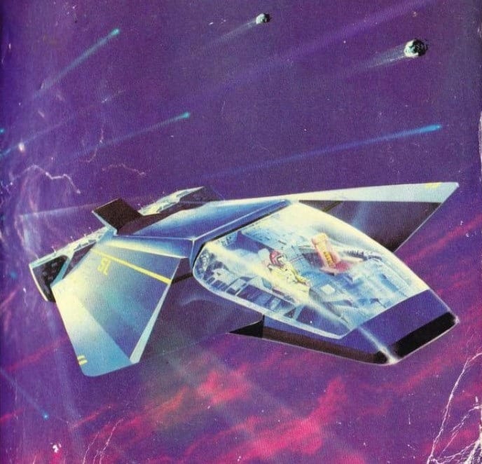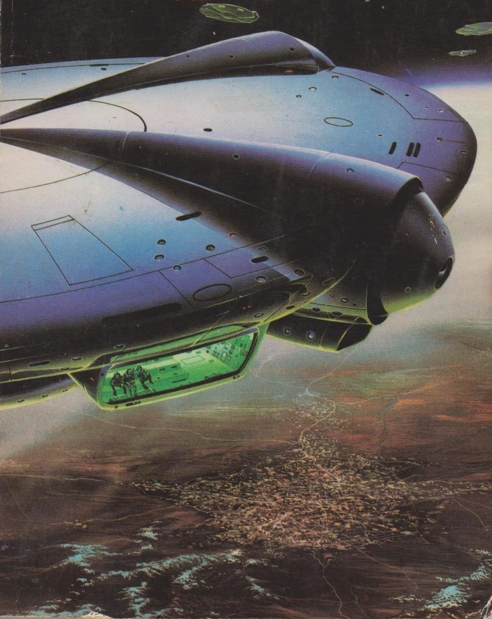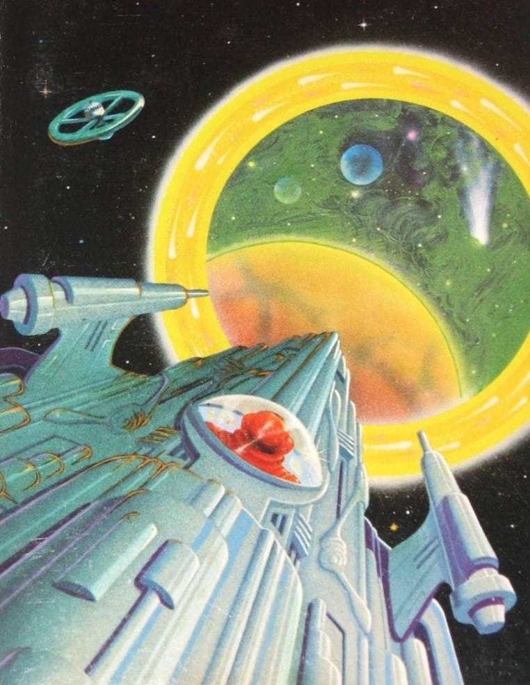 Ken Barr's 1980 cover to Andre Norton’s Star Gate features another incredibly tiny ship. And it's an example of another sub-genre of spaceship window: The Spaceman Spiff-style viewport poking out of the top of the spacecraft.