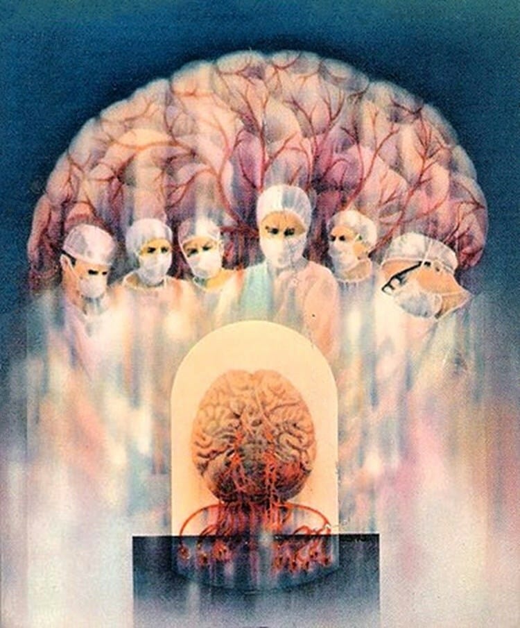 Gene Szafran's 1972 cover for John Boyd's The Organ Bank Farm really drives home the brain transplant theme by including a second, larger brain behind all the surgeons looking at the first one.