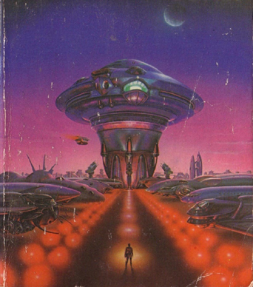 Paul Lehr earns another spot in the epic art category with this classic 1971 cover to Isaac Asimov's Pebble in the Sky. Not that there was any doubt he would... the only surprise here is how subdued Lehr goes for this scene, with relatively muted colors and a spaceship orb that's a mere hundred feet tall.