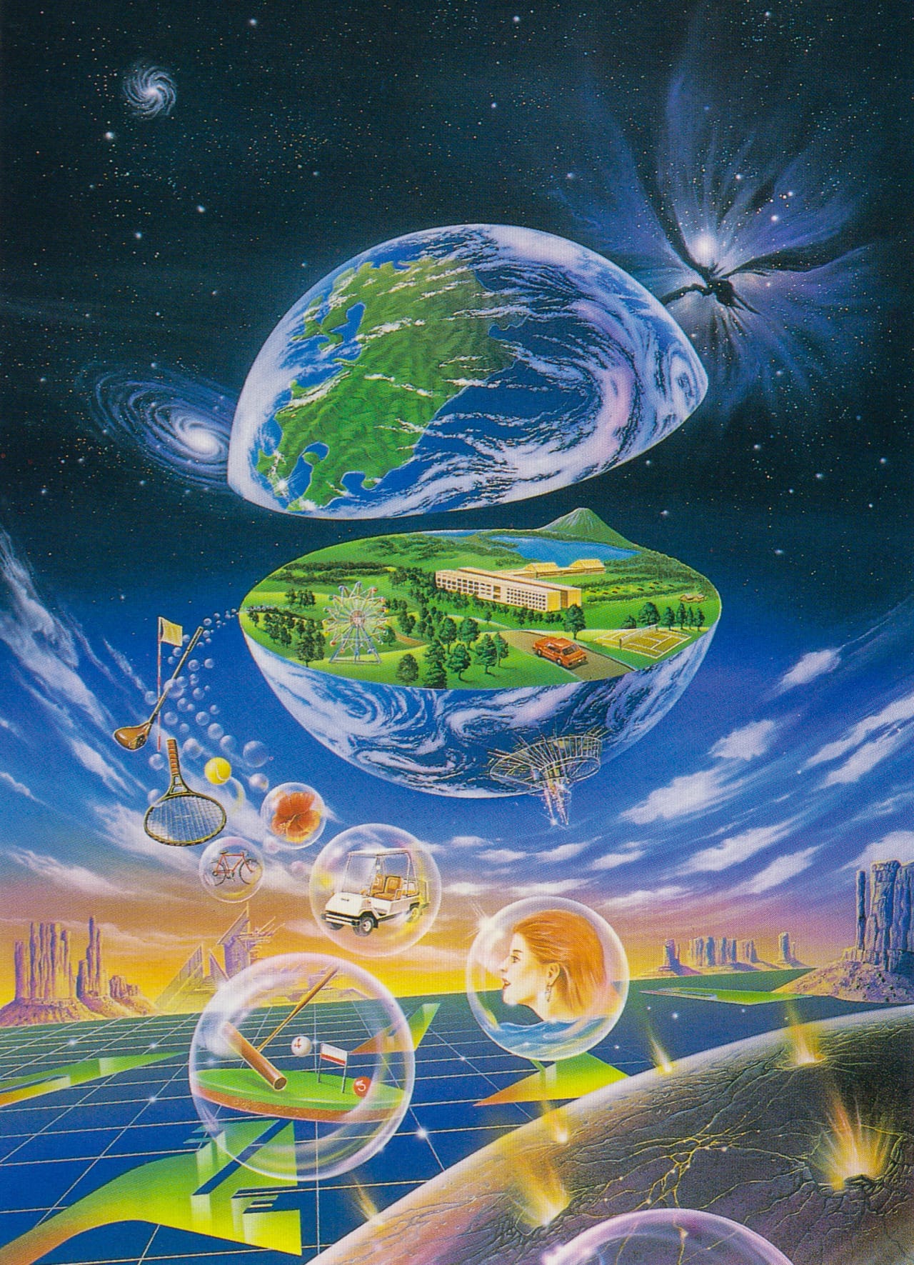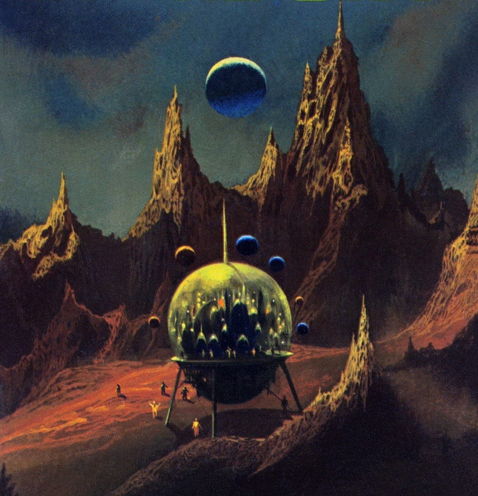 Dexter Dickinson's 1987 acrylic painting “Crossing” delivers a key element in the best sci-fi art: It's kinda wierd. Is that a trailer attachment on a hovercraft?