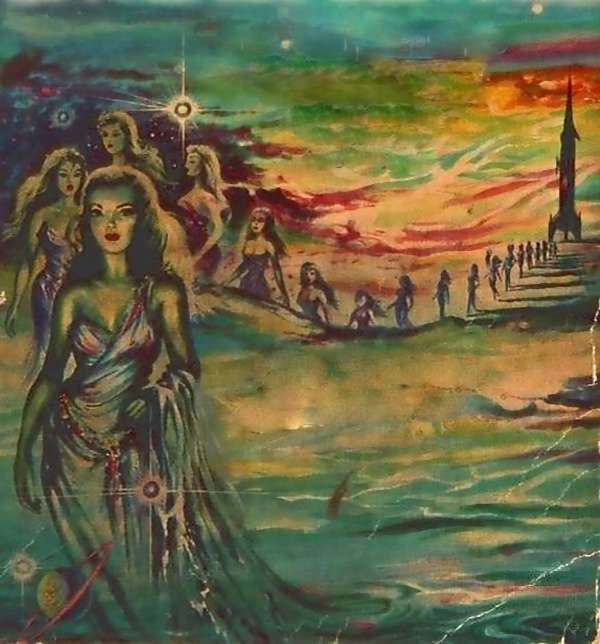 Enigmatic figures on sci-fi covers are more difficult to depict than cool spaceships or landscapes, but when they work, they work. I really like the troop on the uncredited (but likely Johnny Bruck) cover to Der Dämonenprinz, the 1969 German edition of Jack Vance's The Palace of Love.
