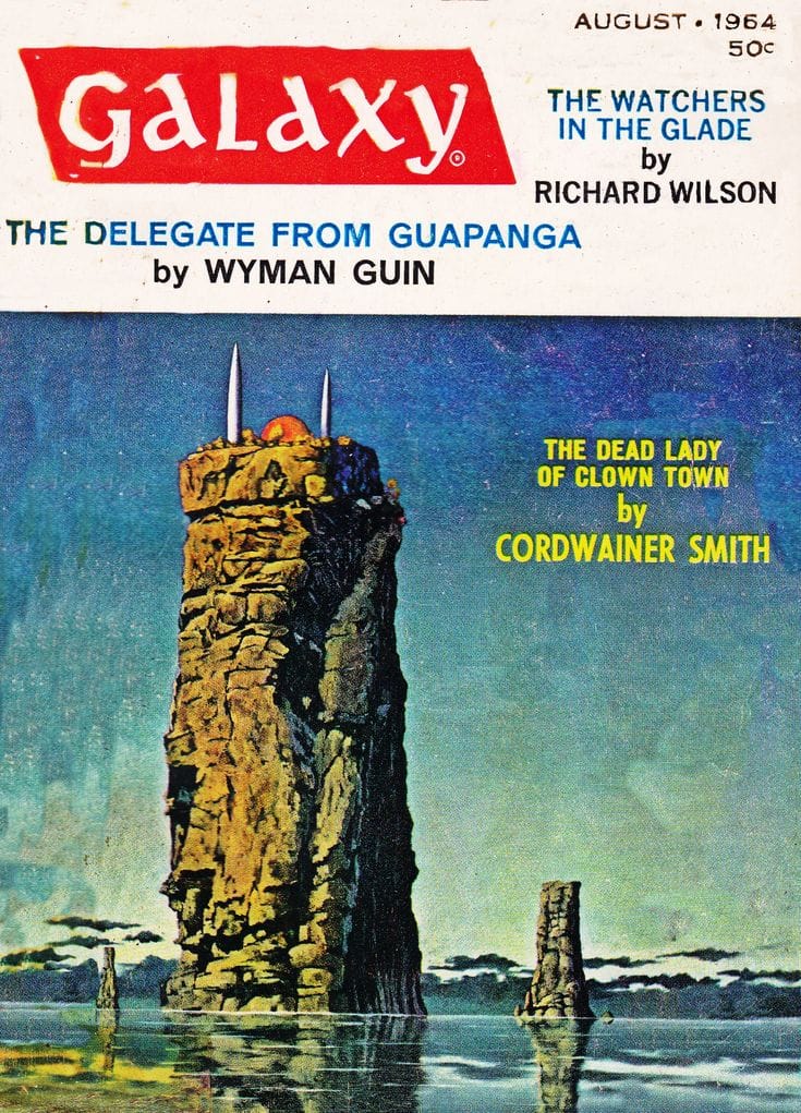 I wonder if Feibush drew any inspiration from John Pederson, Jr.'s August 1964 cover to Galaxy magazine, which also features multiple tall rocky tower islands.