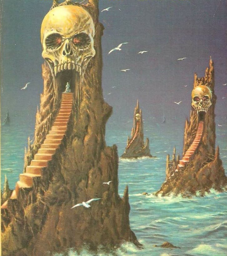 First, this is a great excuse to showcase my favorite Ray Feibush artwork again. Well, technically, it's not credited, but I'm very confident it's Feibush, given that he was a UK illustrator who fixated on skulls and had a style often mistaken for Bruce Pennington.