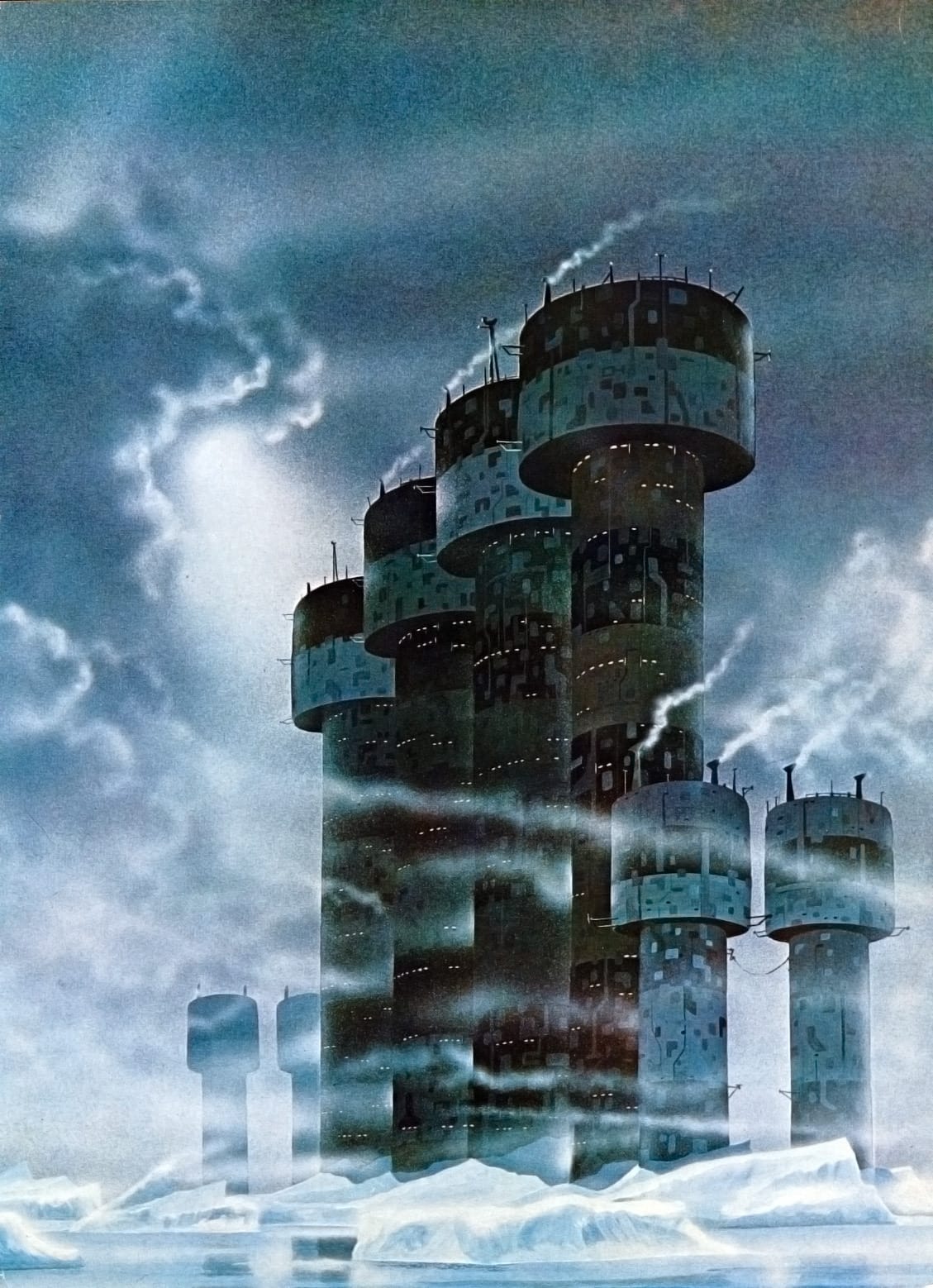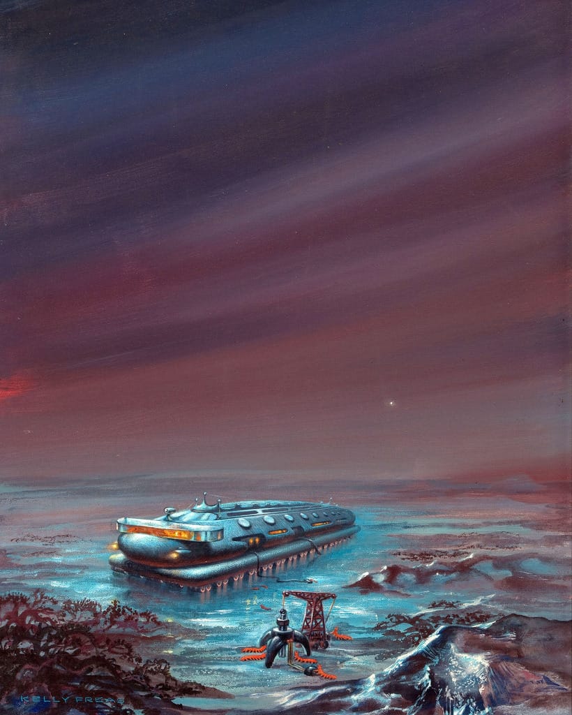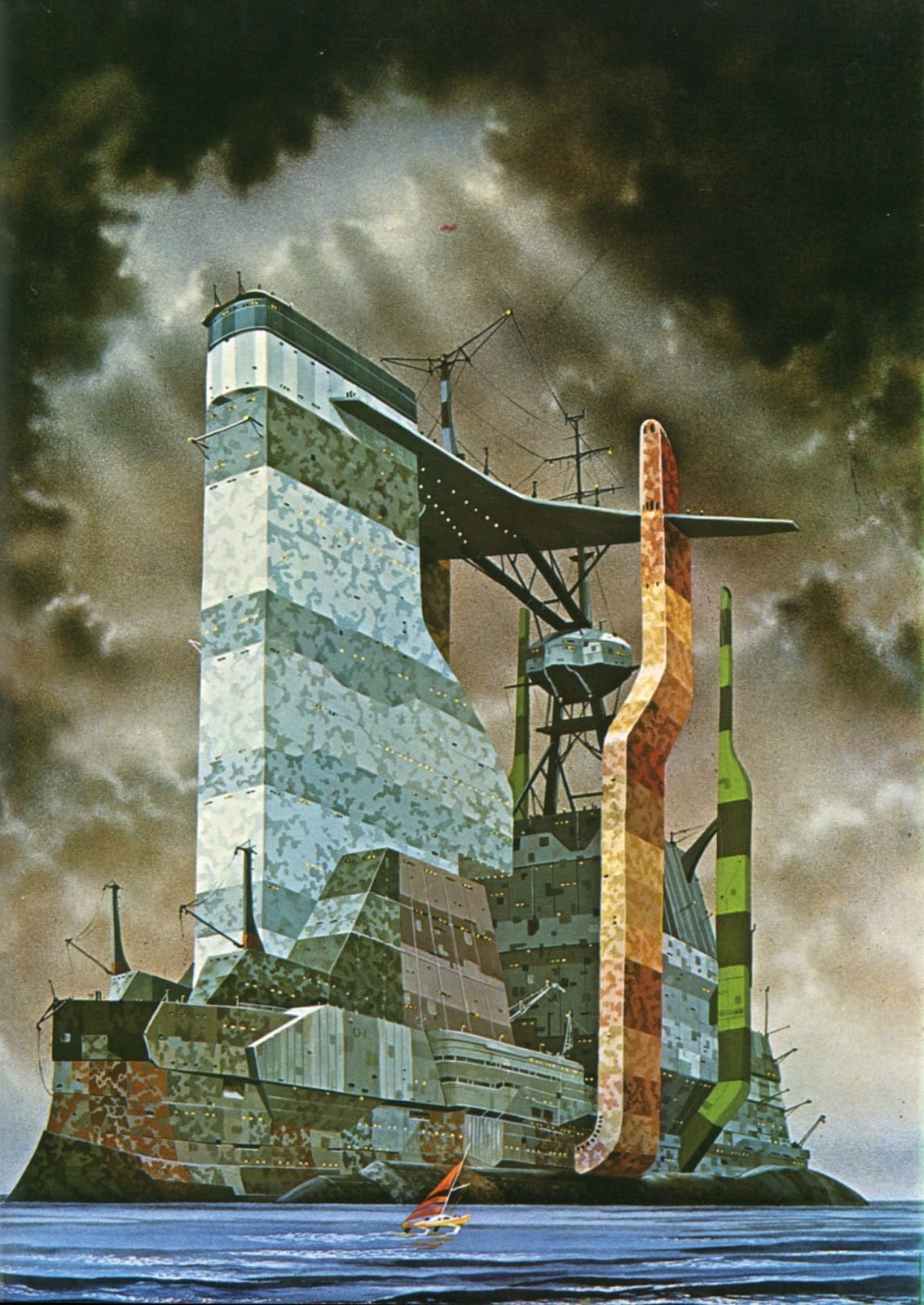 Today, let's take a look at the dilapidated oil rigs, island castles, surfaced submarines, and floating barges of retro sci-fi.