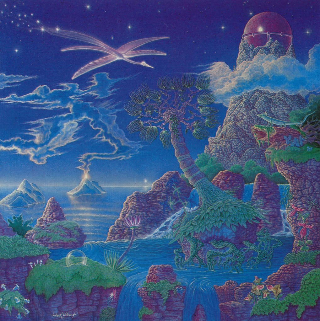 Here's a great island outpost, featuring an orb-like observatory: Gilbert Williams, "Secret Paradise," 1978. Scanned by RetroSciFiArt from the 1979 collection Celestial Visitations- The Art of Gilbert Williams.