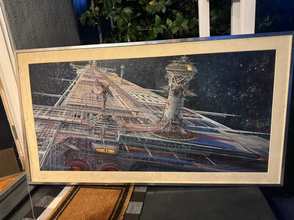 Someone was pointed to me after they found, while cleaning out their deceased father's garage, what appears to be an original Peter Ellenshaw 60 x 28 inch illustration of the USS Cyngus spaceship, done as concept art for the 1979 Disney movie The Black Hole.