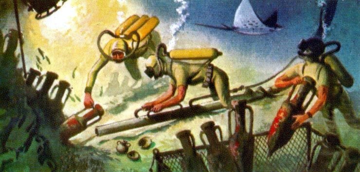 I also include a roundup of other dolphins in suits in the post, and I just updated it with a new one that I recently spotted on Bluesky, posted by Ranaroth. It's by Ley Kenyon for a card on "Living underwater" from the 1974 card set "The Sea Our Other World," from Brooke Bond: