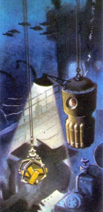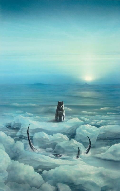 Coulthart says: "I can see why the art director wanted the dog removed—the cover is better with all the viewer’s attention drawn to those insectile legs—but Burns’ colour scheme is spoiled by the greenish tinge of the printed version. Ice is a difficult substance to paint well. If I was Burns I would have been a little annoyed that all those icy details had been lost."