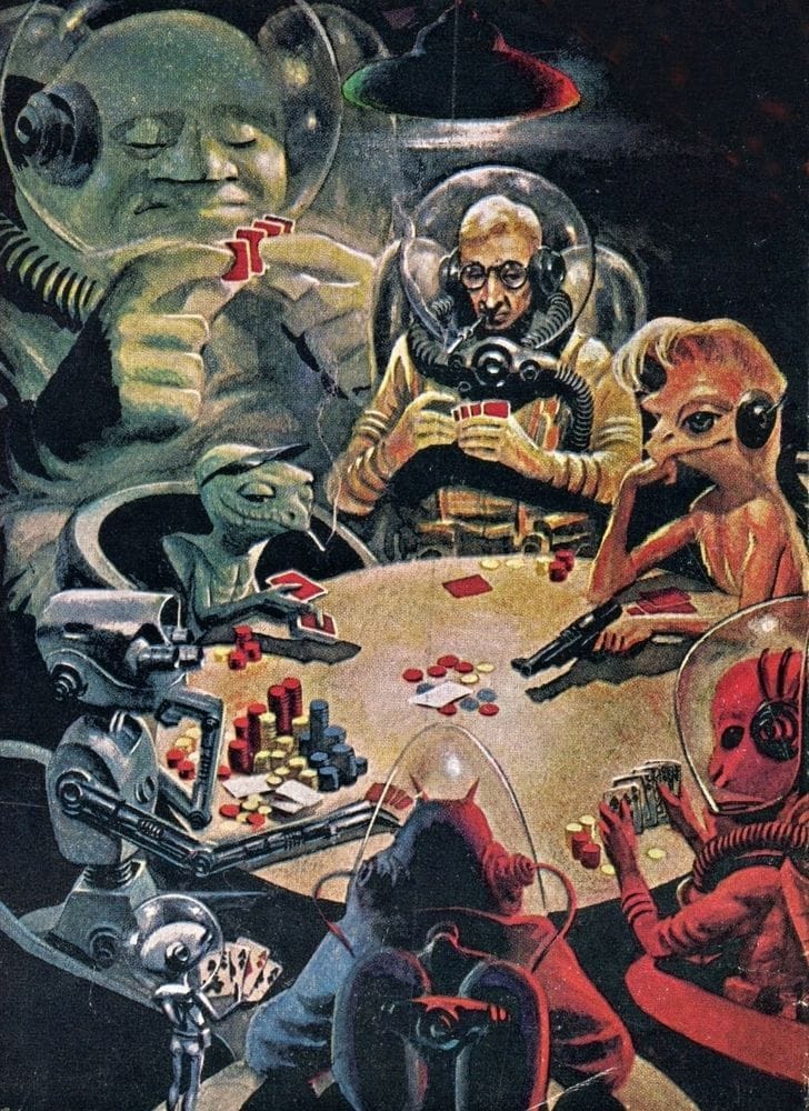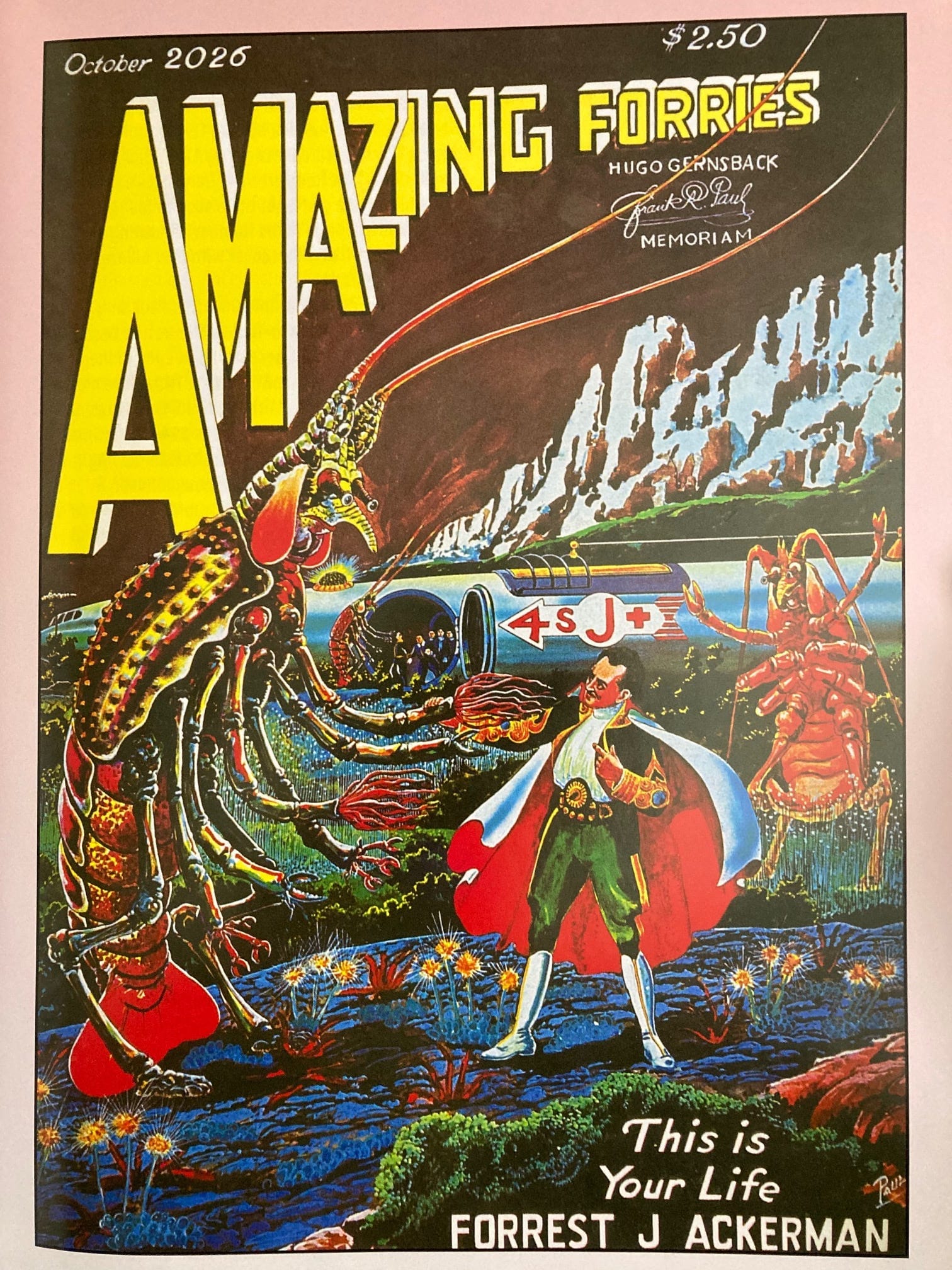 In 1959, Forrest J Ackerman commissioned Paul to do a new version of an old Oct 1926 issue of Amazing Stories. Ackerman had Paul add a century to the publication date, and change the title to a pun on his own name. The “4 S J +” on the spaceship was added, too, in what I assume is another name reference.