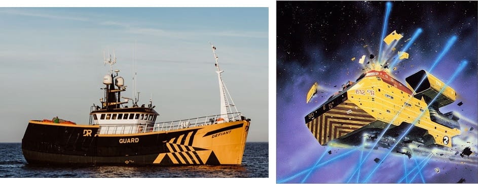 Over on bluesky, a nautical history shitposter made some fun Chris Foss ship comparisons, constrasting the way that Foss paints bizarre stripes and checkers on spaceships against the "dazzle" designs on real-life ships.