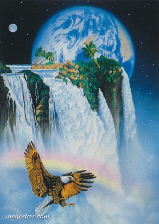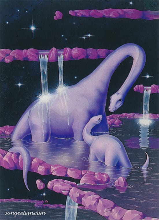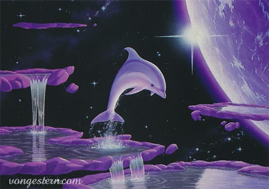 My favorite is the dinosaurs in a space waterfall. But the companion piece featuring dolphins is great, too. And then you really want to round it out with an eagle in space, as well. And that car in a lightning storm is pretty sick...