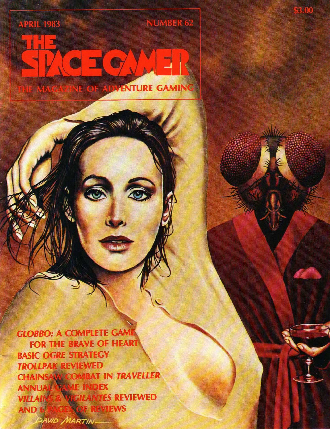 David Martin's April 1983 cover for The Space Gamer #62 would have been a fit for my Bug Aliens in Love post. According to the Old School FRP Tumblr post I got it from, the title of the piece is "Your Fly is Open," which is just an incredible pun.