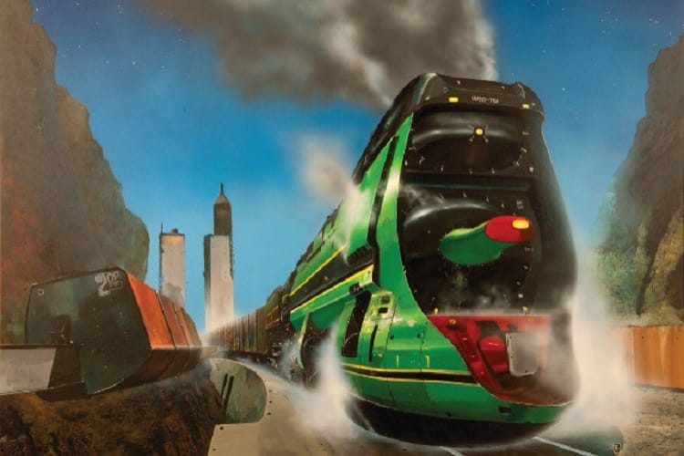 One commenter mentioned the absence of Chris Foss's 1991 poster "Night Banker" in my roundup of train art, which is a good point. Clearly I forgot about it since I mentioned it in my Chris Foss bio for Popular Mechanics back in 2016!