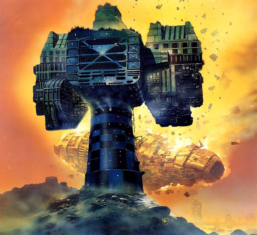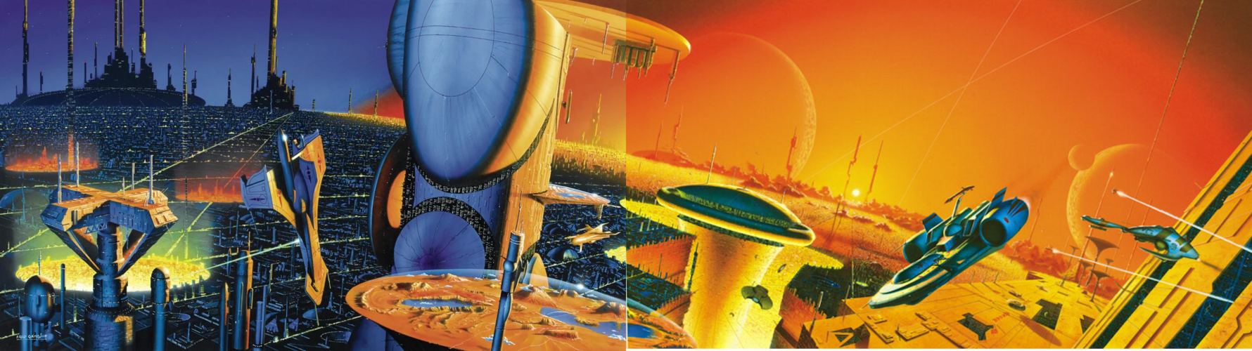 Fred Gambino's series of six covers for the 1994 editions of Asimov's Foundation titles can all be combined into a single sprawling scene, likely depicting the planet Trantor, as a teal night gives way to a blazing orange day.
