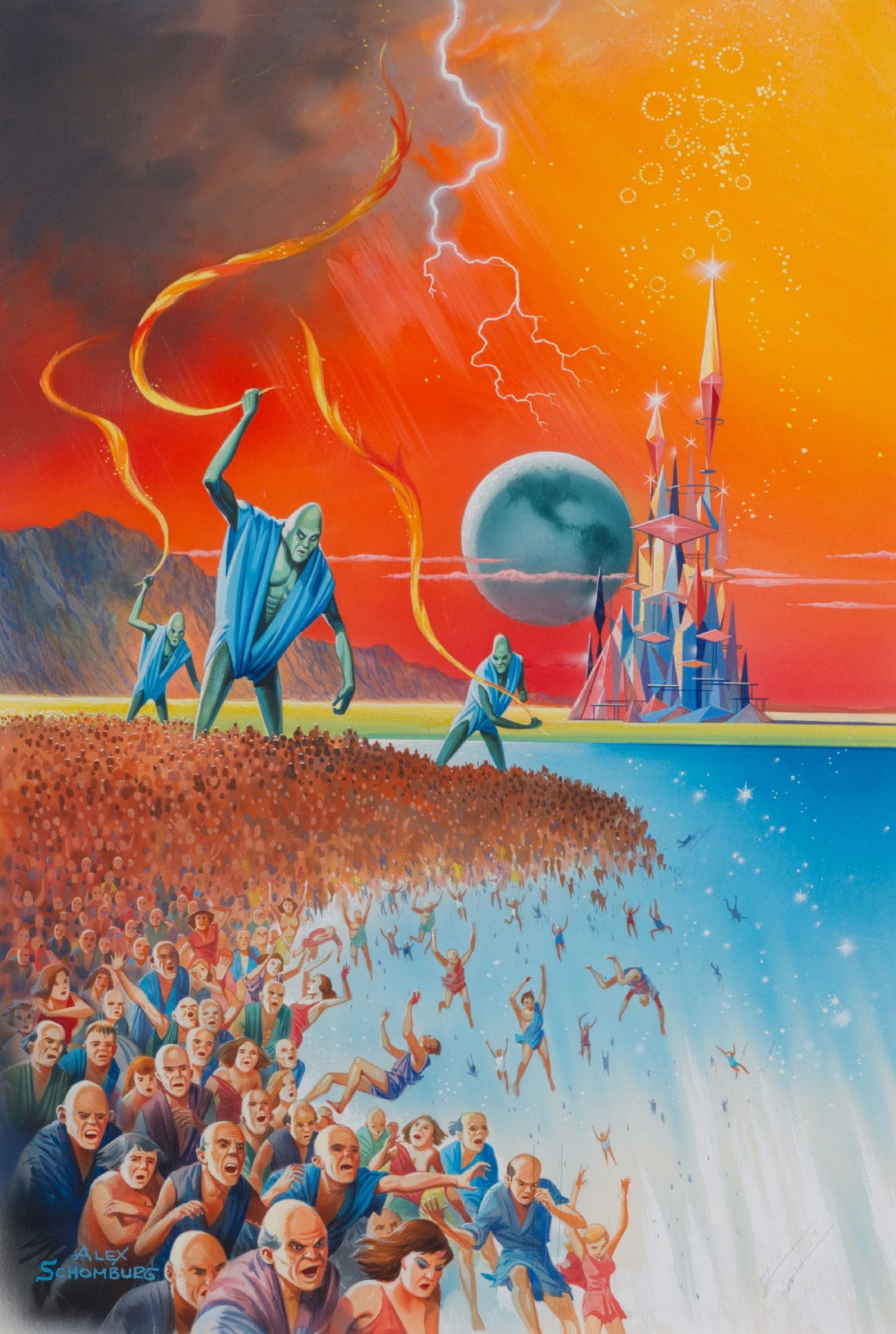 There's also whatever's going on with Alex Schomburg's 1965 cover to The Well of the Worlds by Henry Kuttner, where the color contrast helps the viewer tell the difference between the sky and, uh, I guess that's the lower section of sky?