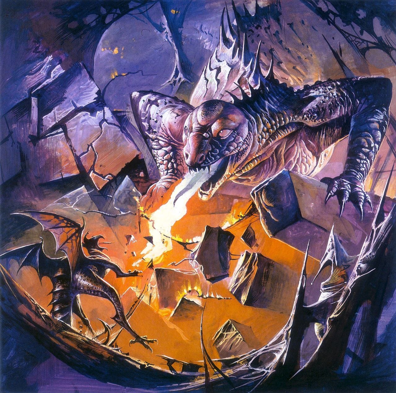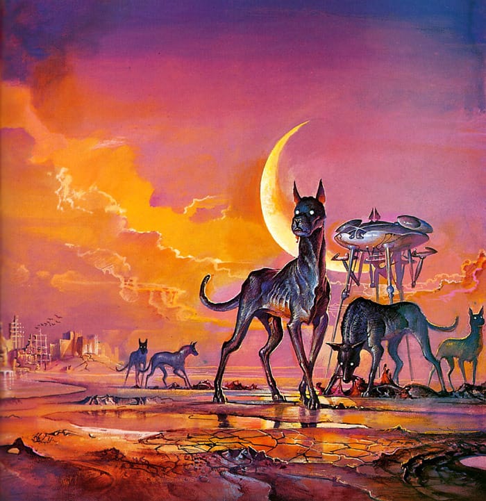 This Bruce Pennington illustration of hounds in an alien apocalypse – his 1984 cover to The Book of Frank Herbert – includes plenty of other colors as well, so it might not be the best example. But it's very pretty!