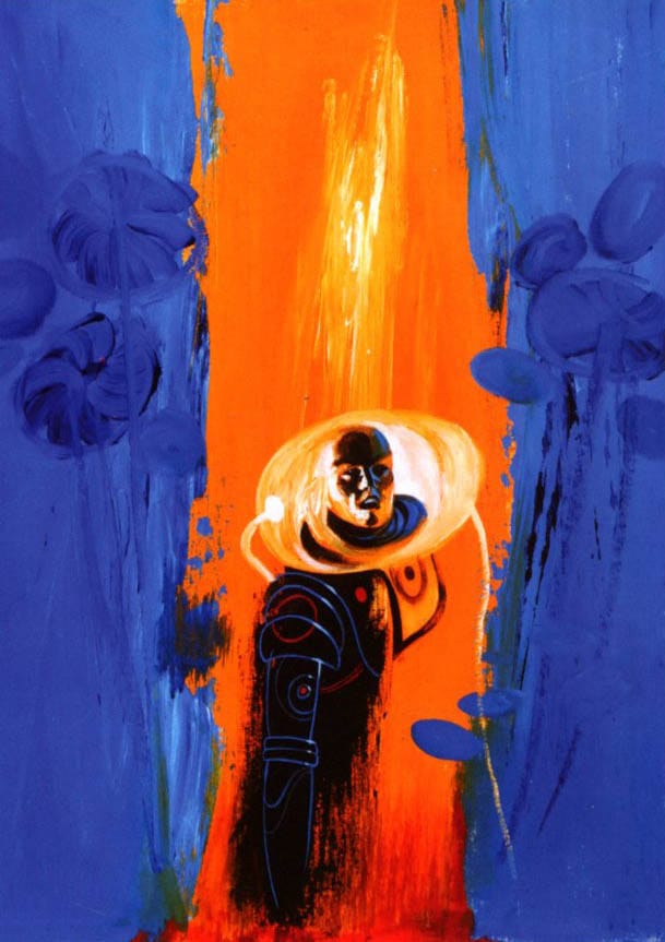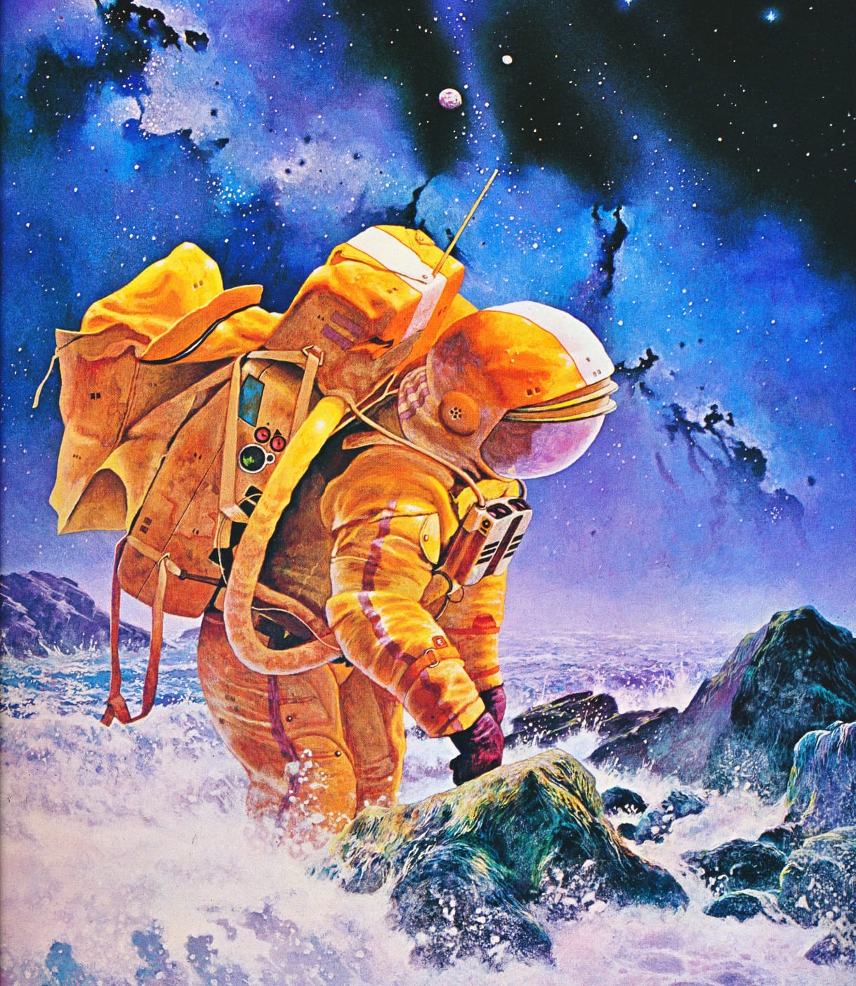 The most beautiful spacesuit depicted with this type of color scheme has to be David Bergen's 1977 cover to Charles Logan's Shipwreck (which also appeared that same year in The Flights of Icarus art collection by Martyn Dean, Roger Dean, Donald Lehmkuhl).
