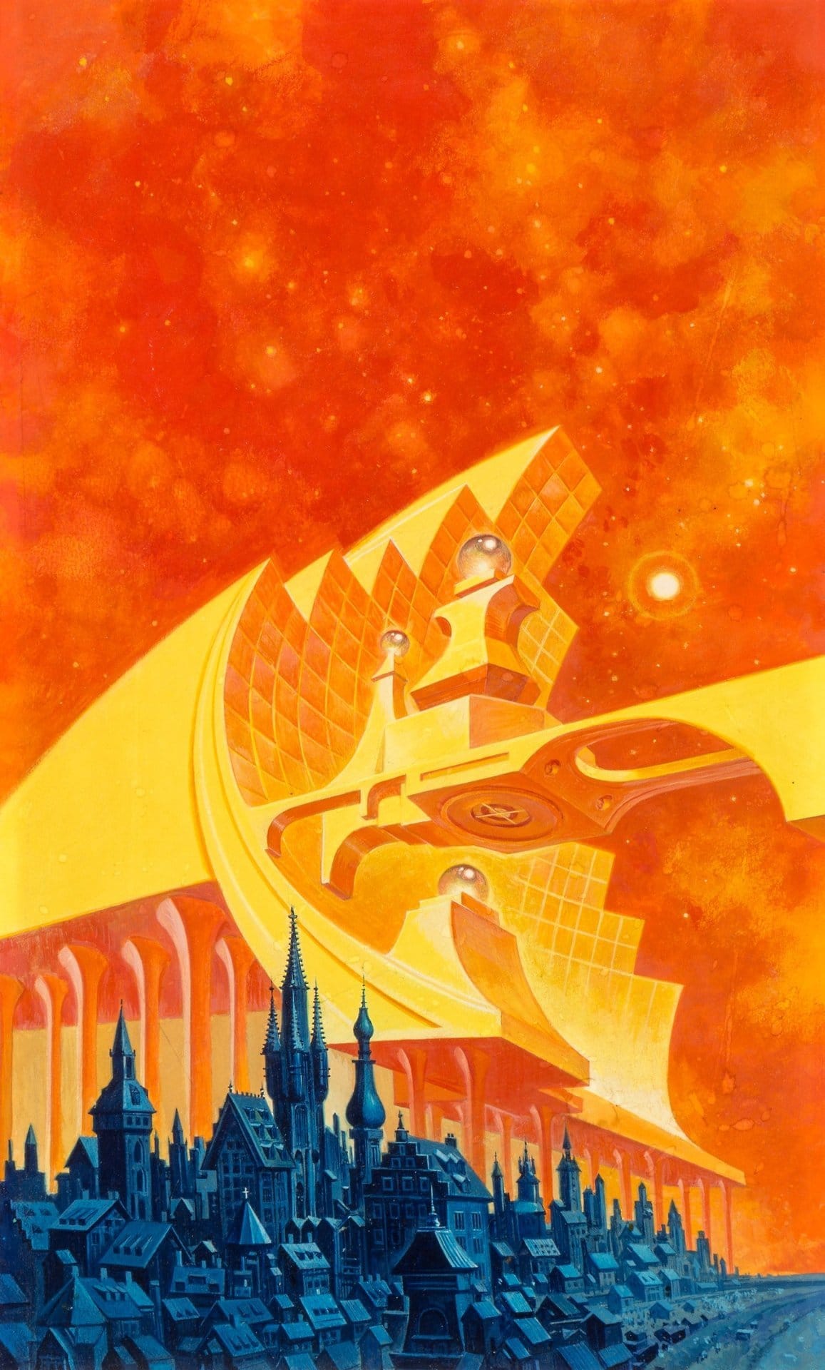 Let's start with Davis Meltzer's 1975 cover to Mack Reynolds' two-in-one title The Five Way Secret Agent and Mercenary from Tomorrow. Here, the color contrast serves to separate the steeples of an old town from the golden curves and orbs of a futuristic city expansion.