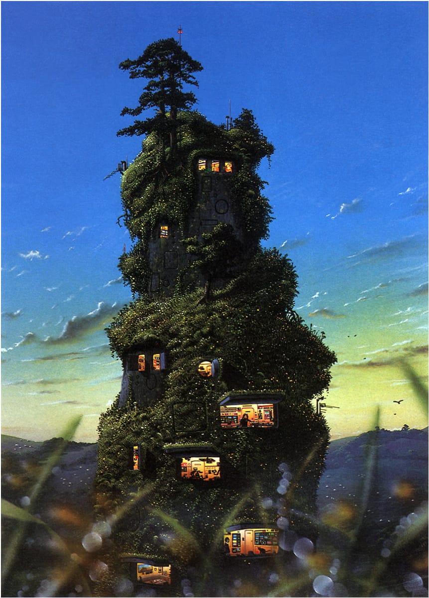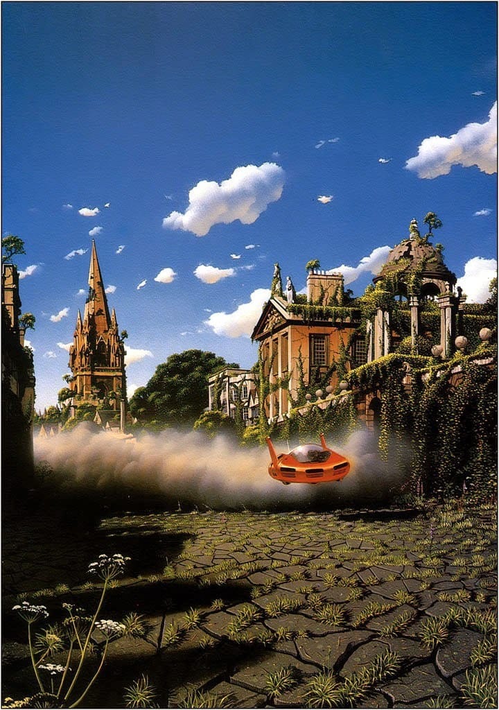 Colin Hay has a beautiful two-page spread in the book, too. It's yet another example of Hay's penchant for showcasing sprawling structures above a tiny landscape at the very bottom of the frame, as readers of my Ocean Outposts issue may recall.