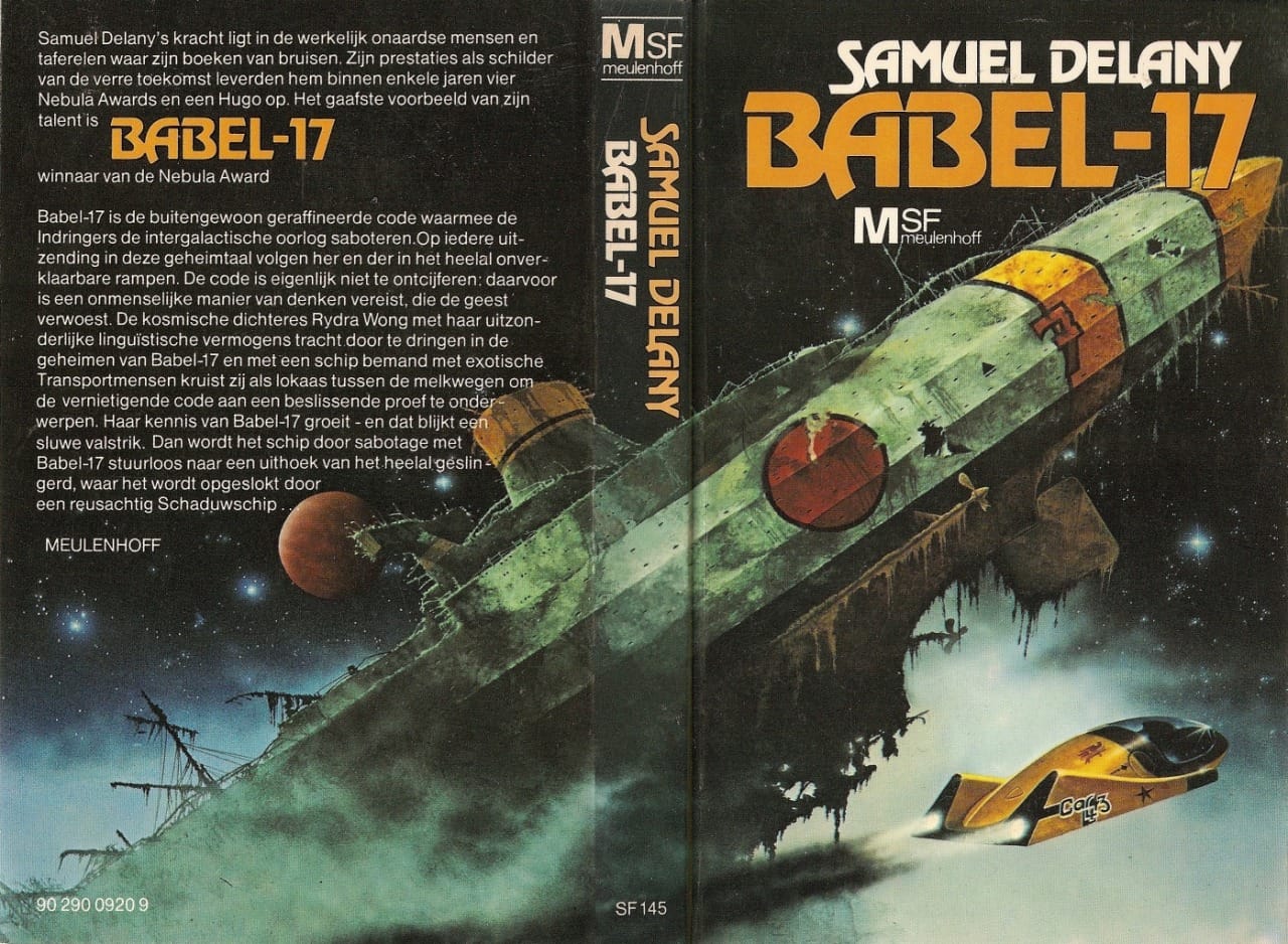 Tony Roberts includes an actual ship on this cover to Samuel R. Delany's Babel-17, along with a spaceship giving it an exploratory fly-by.