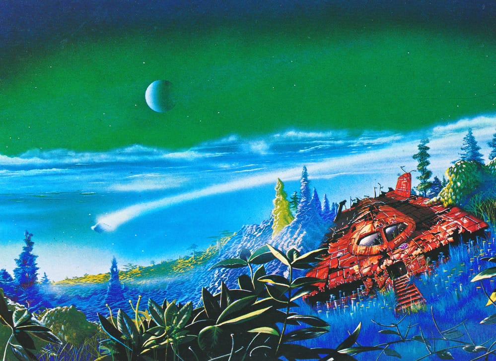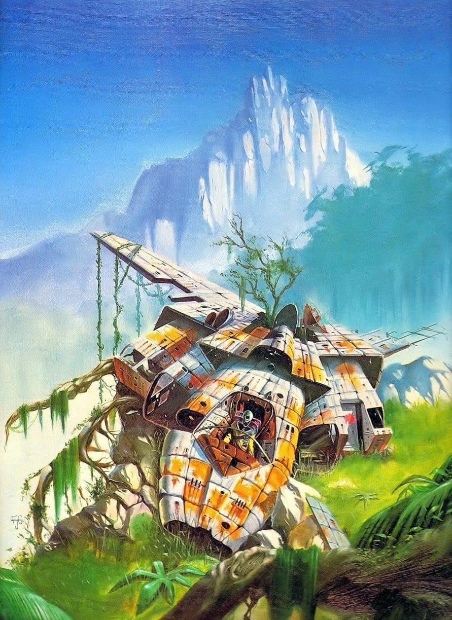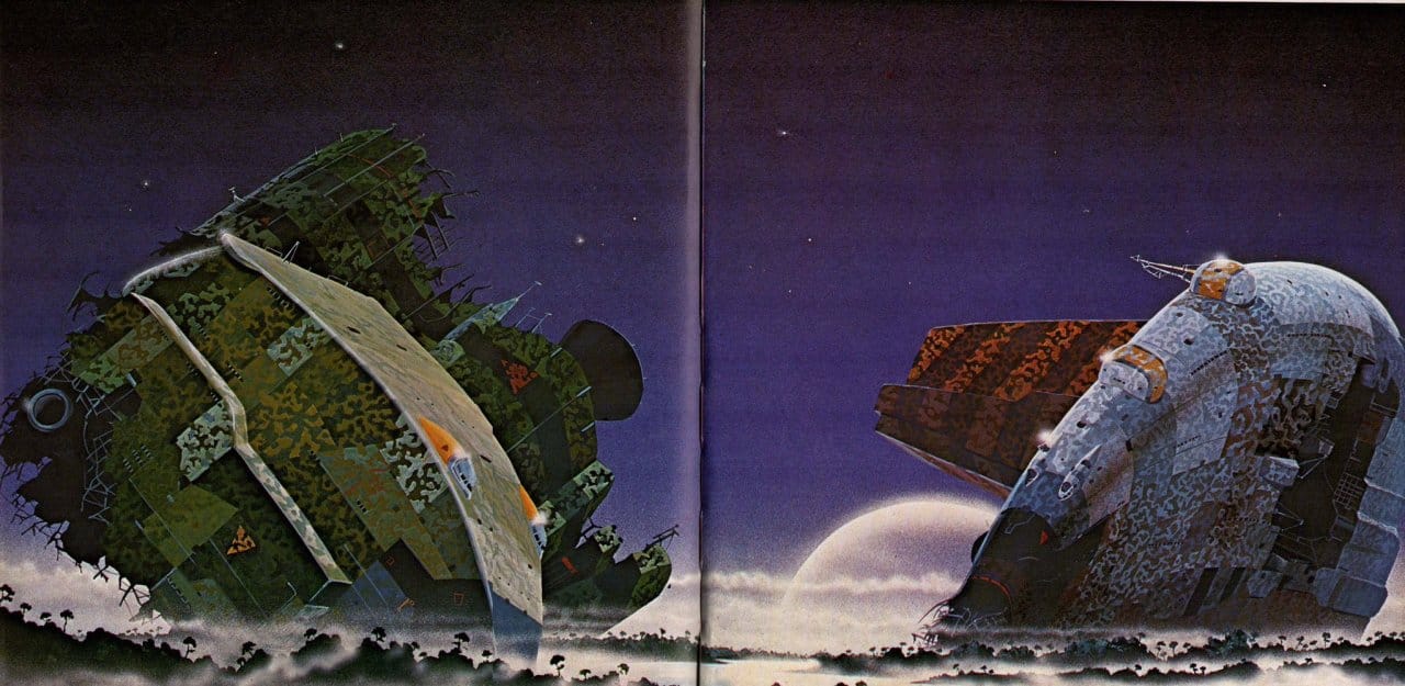 Most of the actual spacewrecks inside its cover aren't overgrown – many are in outer space, empty deserts, or blocks of ice that are also in space. This ancient alien missile battery by Bob Layzell is one exception.