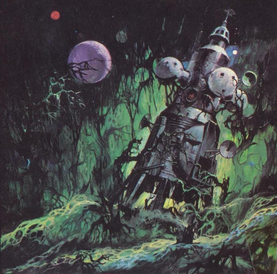 I'm not sure if that spherical spaceship on Paul Lehr's 1977 cover for The Embedding, by Ian Watson, is actually overgrown.