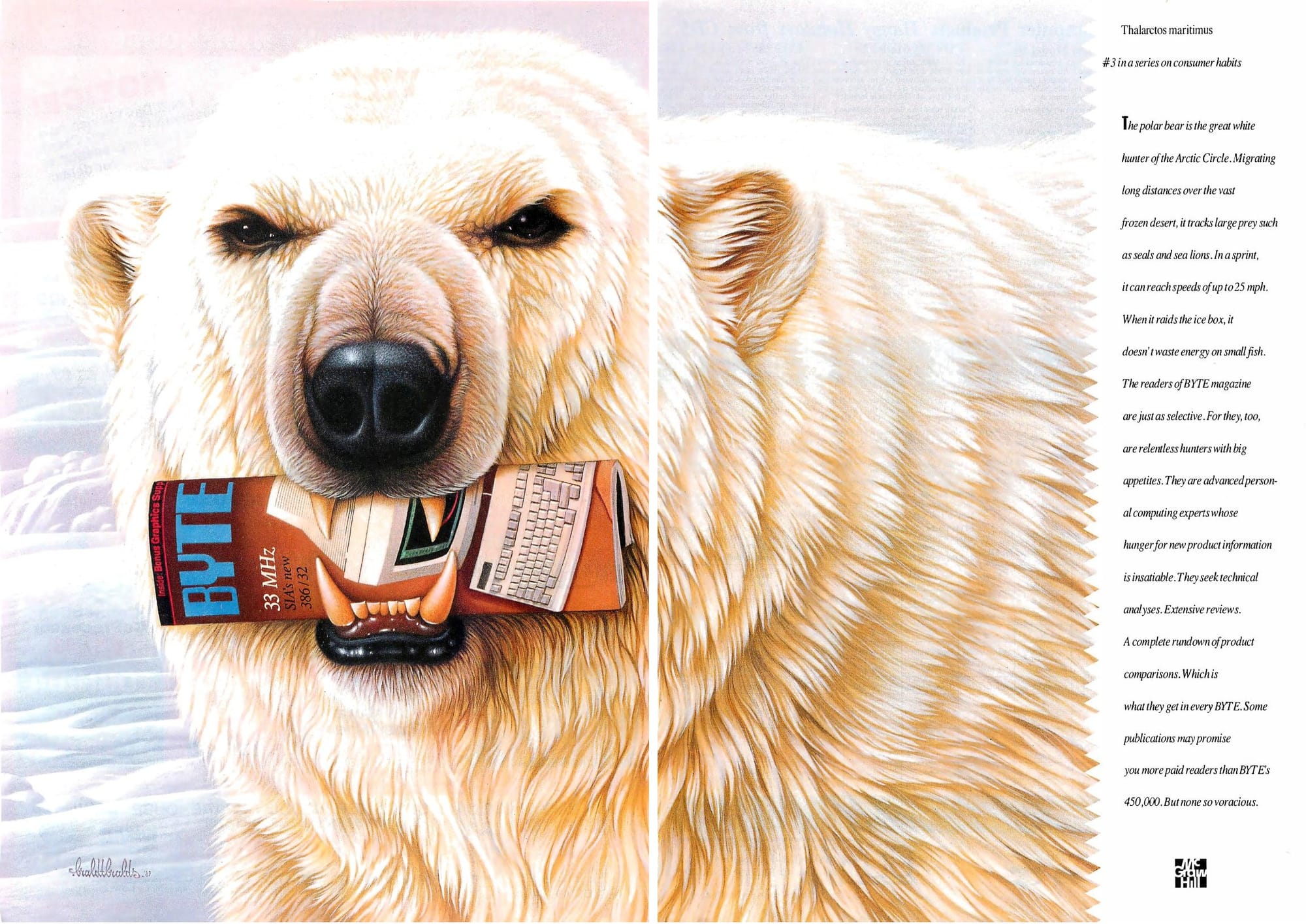 Here's a 1982 Byte magazine ad, done by Braldt Bralds, which ran in the magazine's December 1989 issue. Why? Because BYTE magazine readers are "relentless hunters with big appetites."