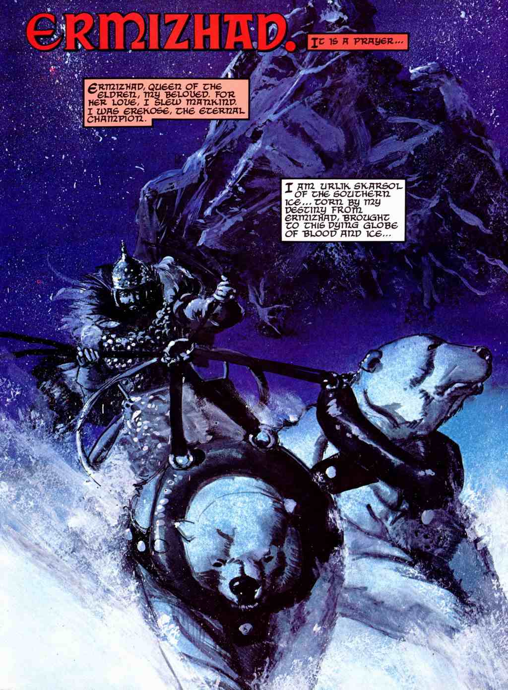 As one blogger at the Ragged Claws Network puts it, “Chaykin’s attempt to supply Urlik Skarsol’s polar bear team with a semi-plausible harness […] actually diminishes rather than enhances Frazetta’s gloriously silly original concept by drawing undue attention to the mundane question of how, exactly, the fantasy hero’s cool mode of transportation could be made to work in the real world and whether Chaykin’s design is, in fact, a viable solution.”
