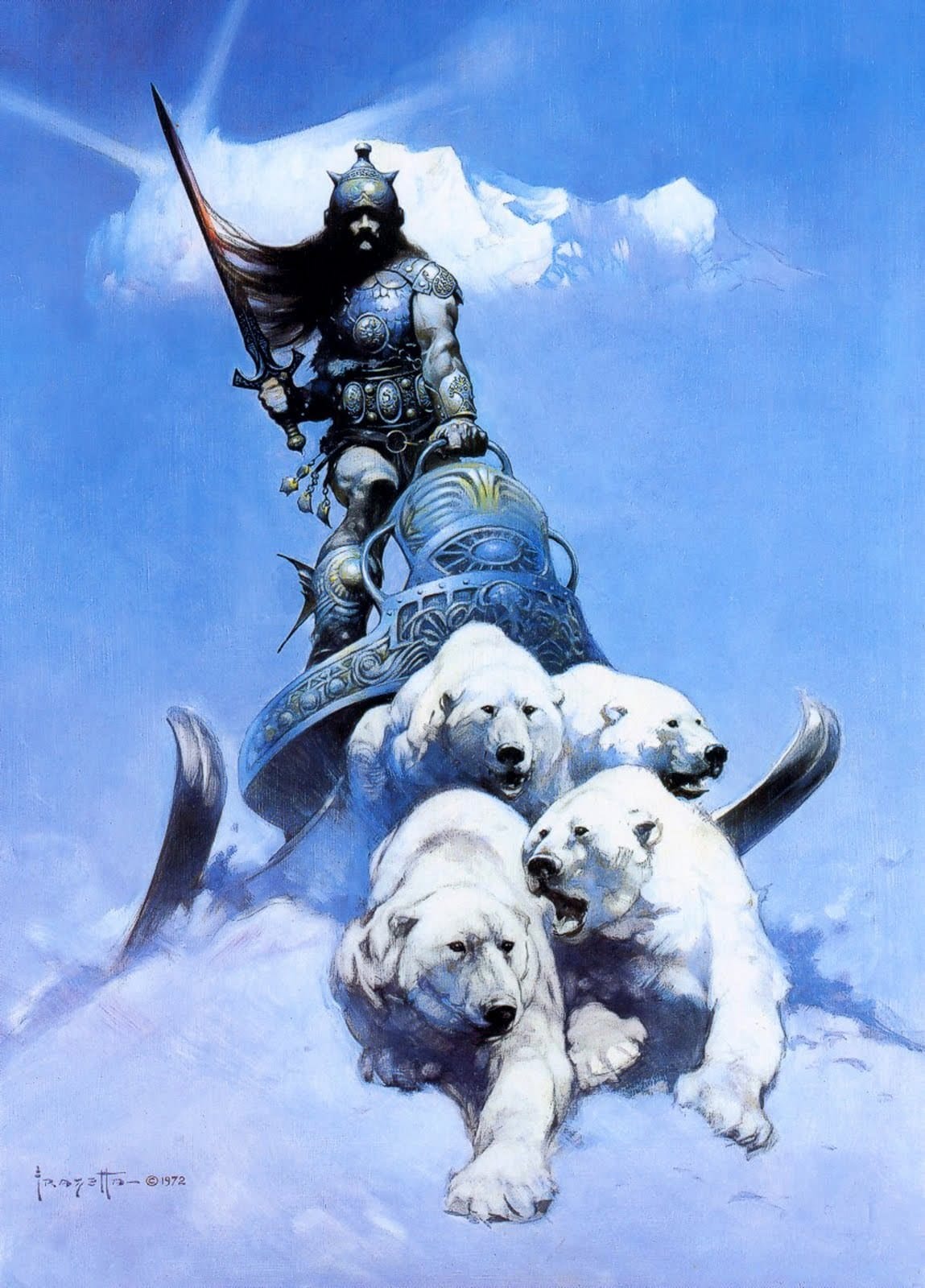 As Frazetta himself put it in a June 1977 Esquire interview: “Harness? HA! Who needs a harness? This is emotion; those bears are coming for you, you don’t have time to see a harness. I paint feelings. I of course thought of the harness, but it would make a ridiculous clutter.”